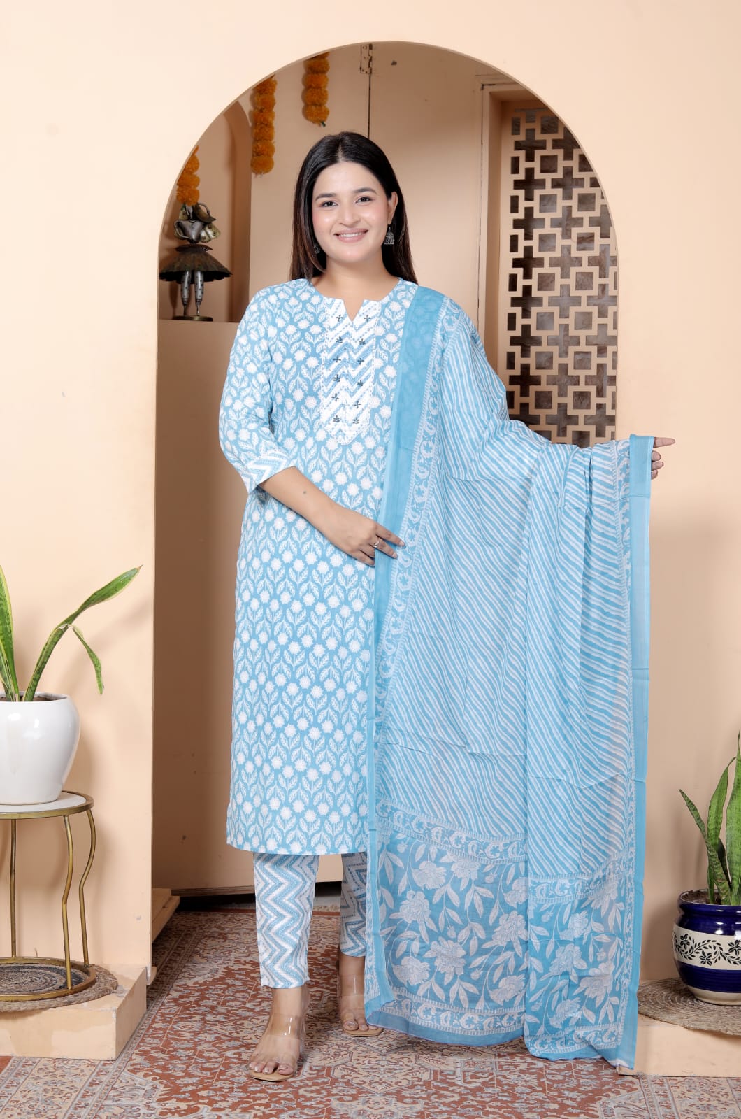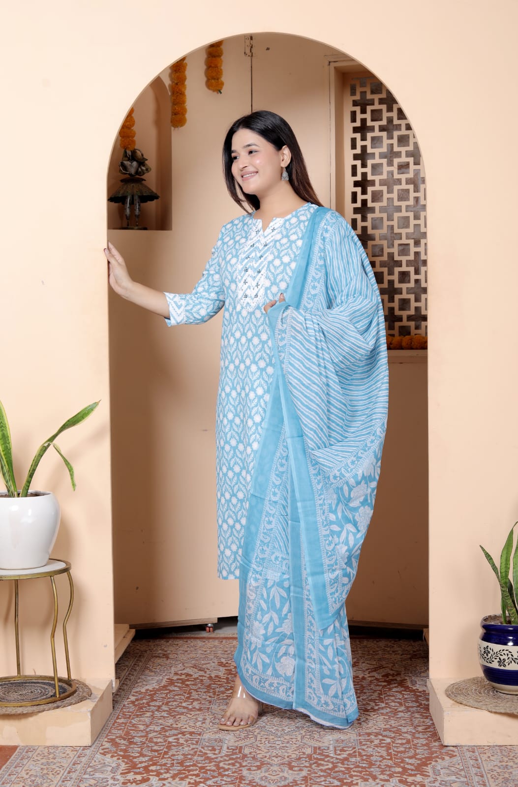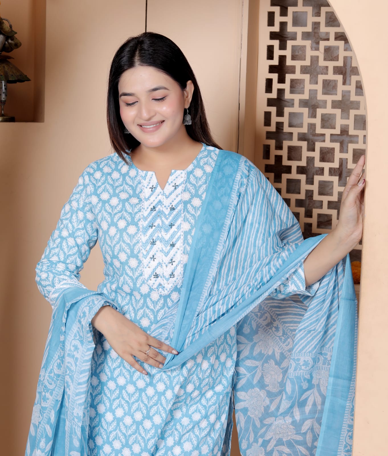 Blue Floral Printed Indian Traditional Readymade Straight Salwar Kameez Kurti Pant Dupatta Set for Women - Set of 3