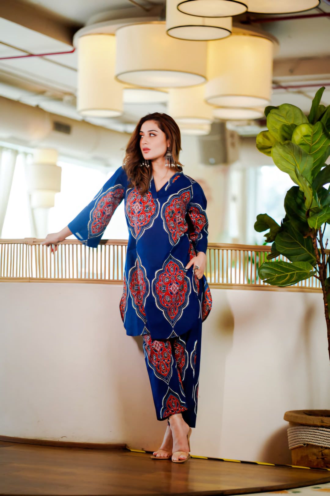Kusum Blue Printed V-Neck Aline Kurti Pant Set Floral Cotton Co Ord Set with Pocket Salwar Kameez for Women