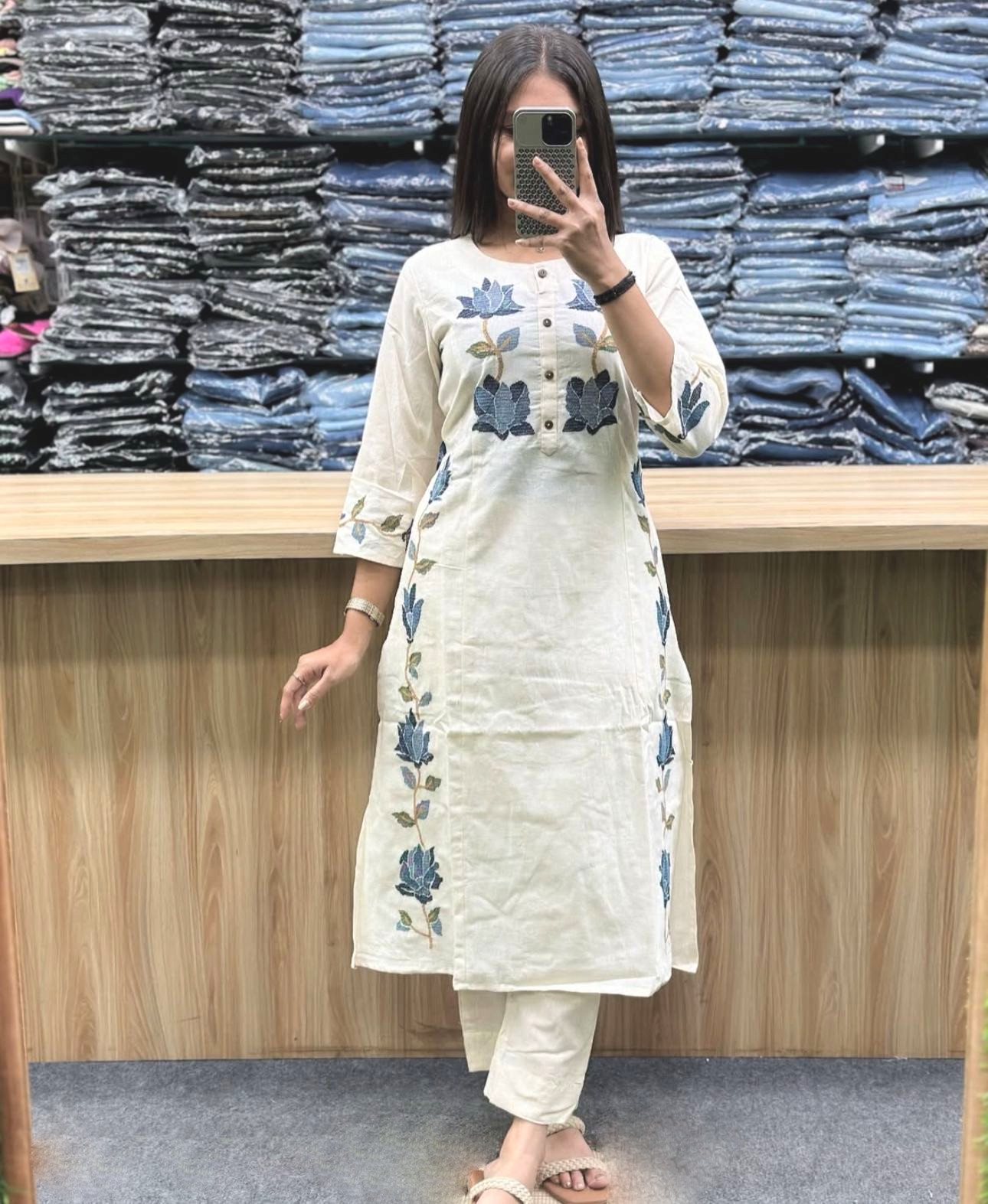 Elevate your style with our Ivory Embroidered Salwar Kameez Kurti Pant Set, an elegant blend of traditional artistry and modern comfort. Crafted from high-quality fabric, this set features intricate floral embroidery it a delicate yet vibrant look. The kurti offers a flattering silhouette, paired with matching pants for a sophisticated look. Perfect for festive occasions, casual outings, or celebrations, this kurta set embodies elegance and timeless Indian craftsmanship, making it an essential addition to any wardrobe.