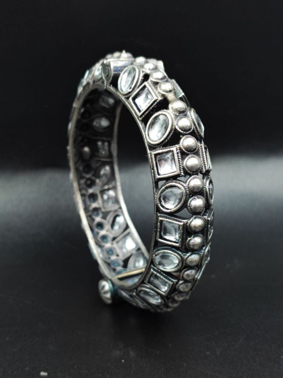 White Indian Traditional Designer Stonework Silver Oxidised Bracelet Kada Openable Free Size Kangan Bangle