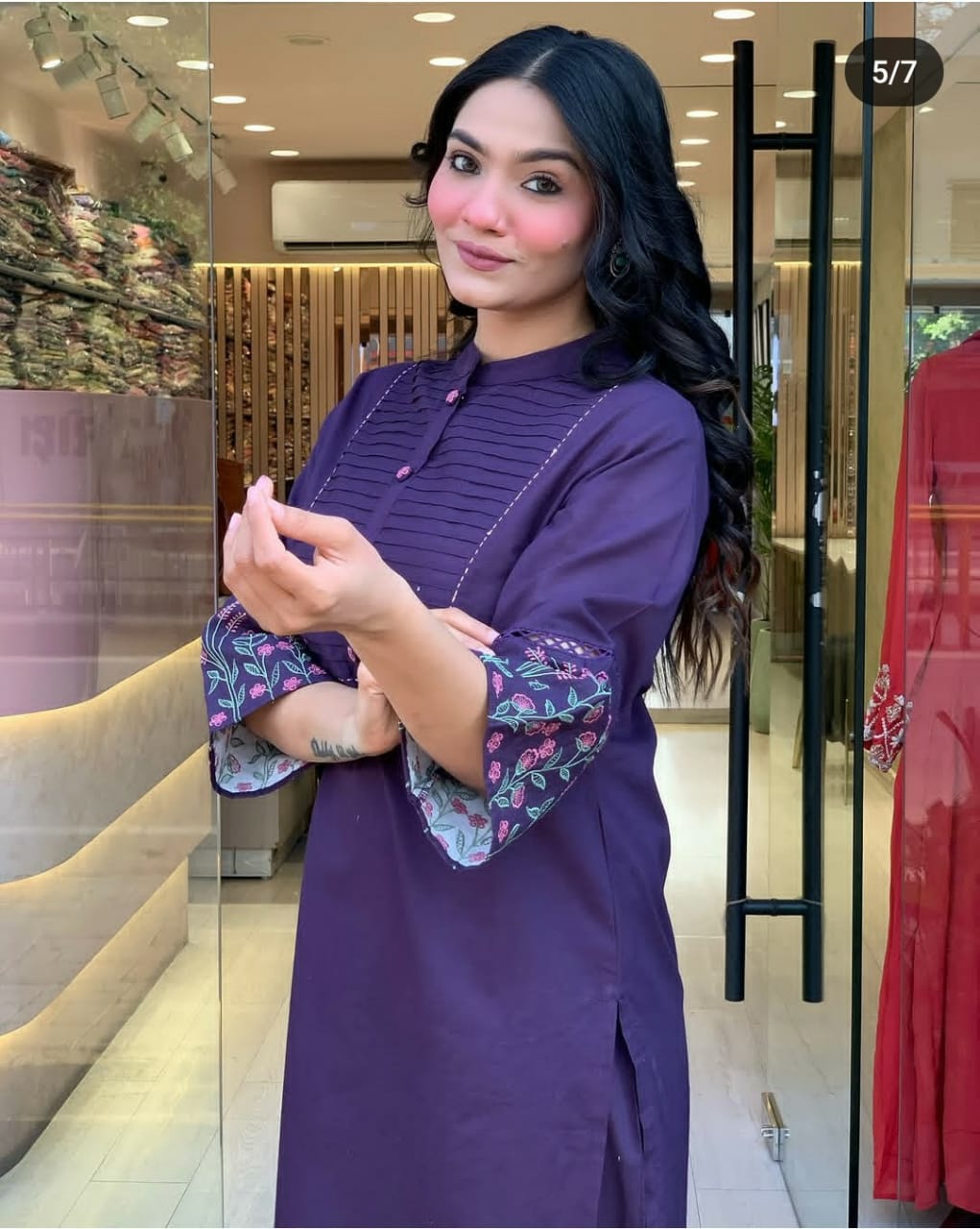 Gulabi City's this solid tone straight-fit rayon kurta features a mandarin neckline with a button detailing on designer pleats on yoke and three-quarter sleeves, this style features matching pant. This is Adorned with leaves embroidered on sleeves, this elegant style is ideal for light festivities.