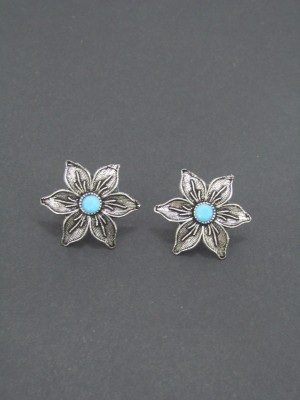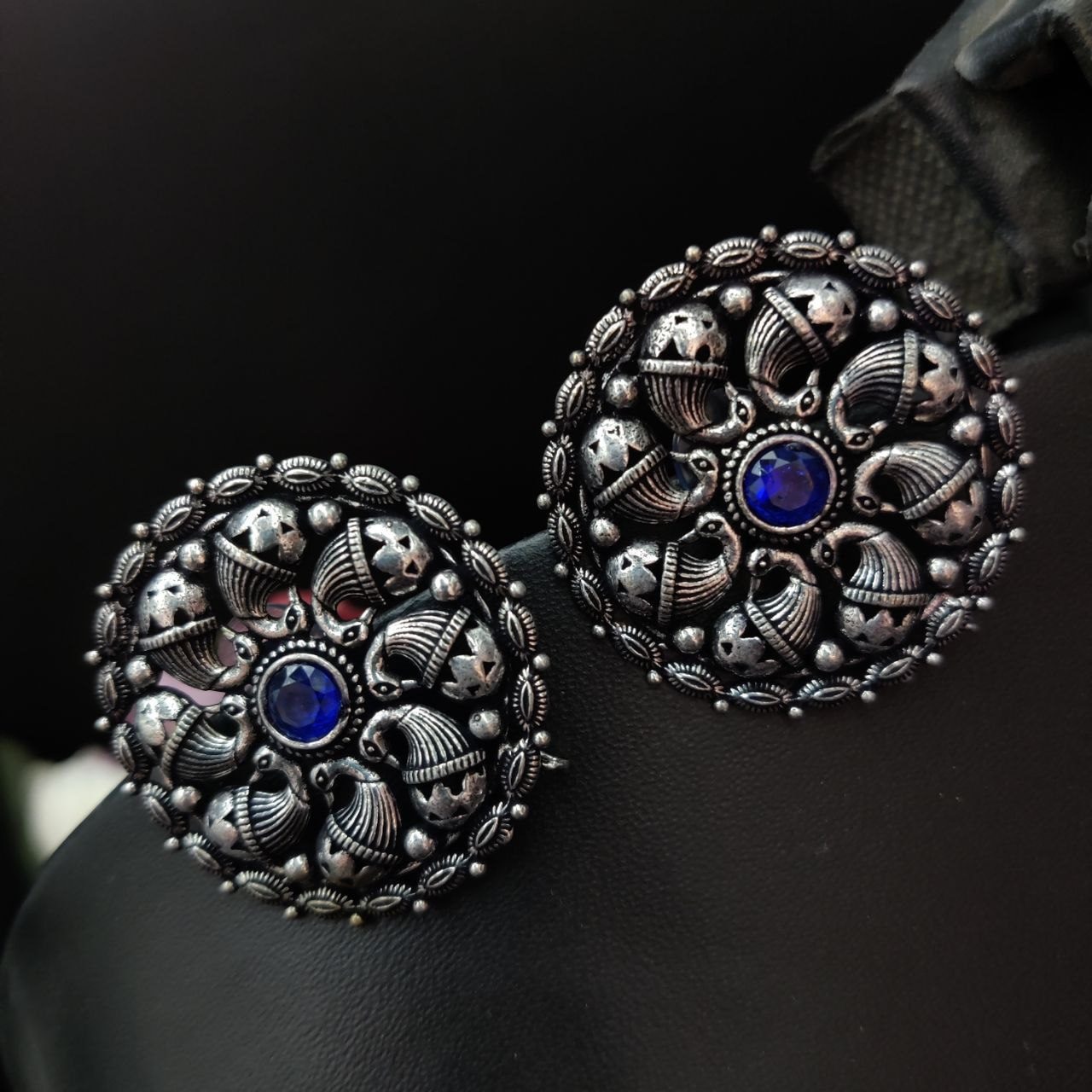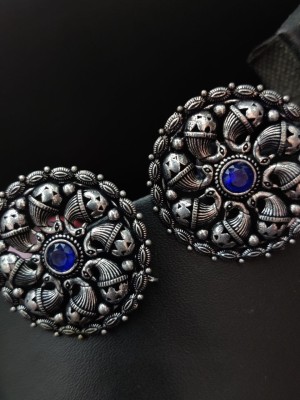 Round Stud Oxidized Earring Blue Stone New Bollywood Studs Pushback Earrings