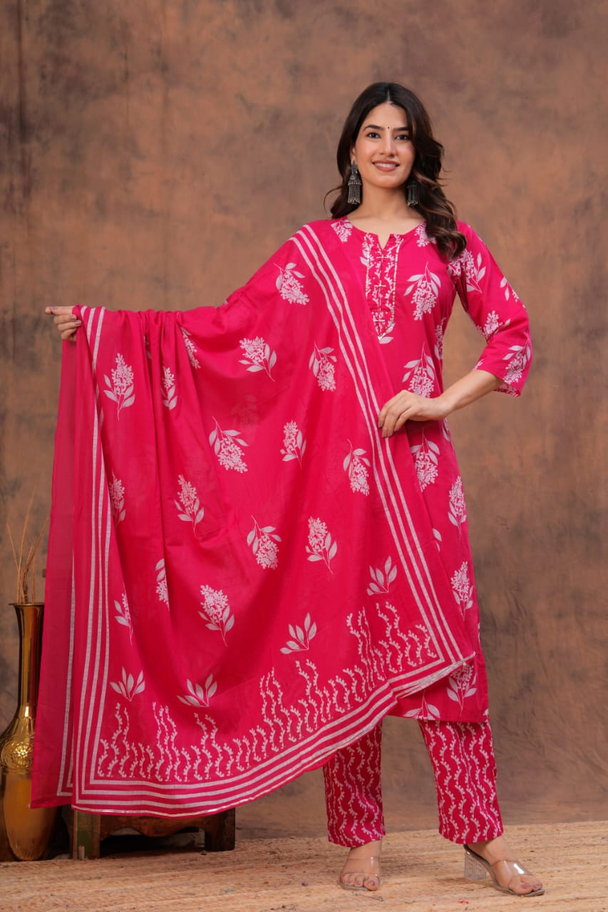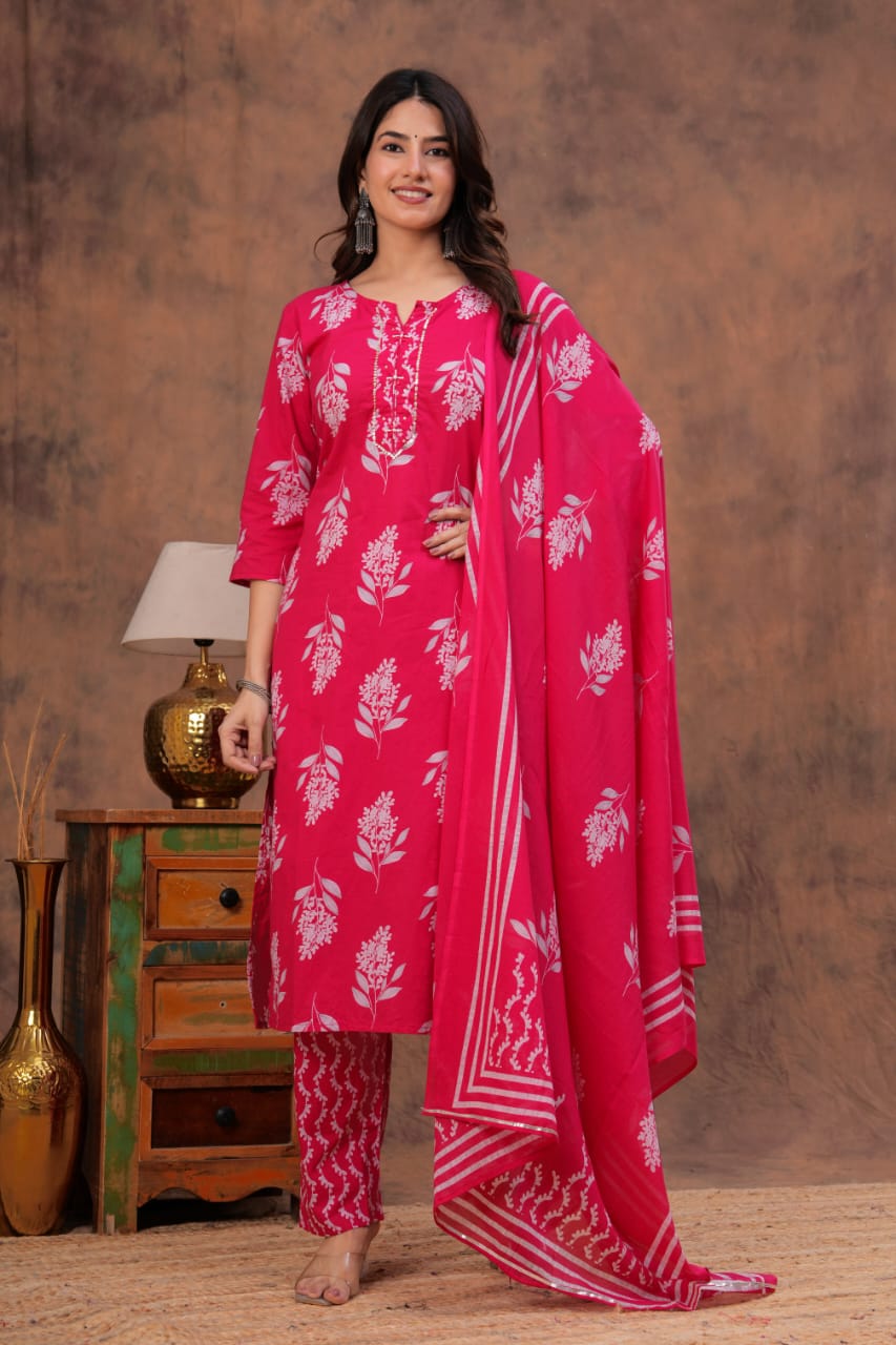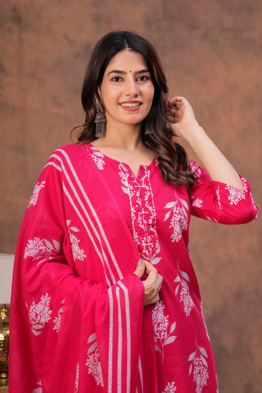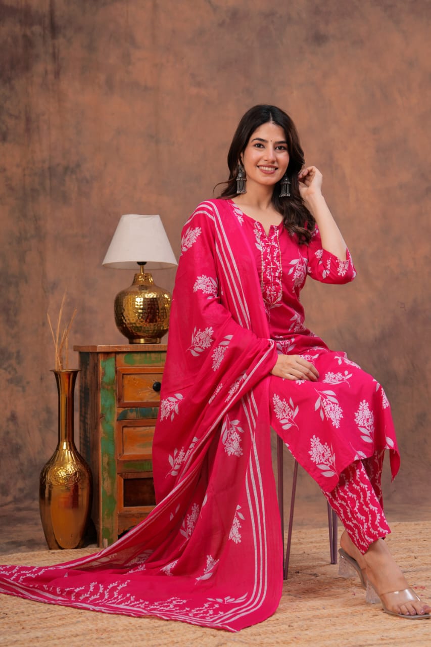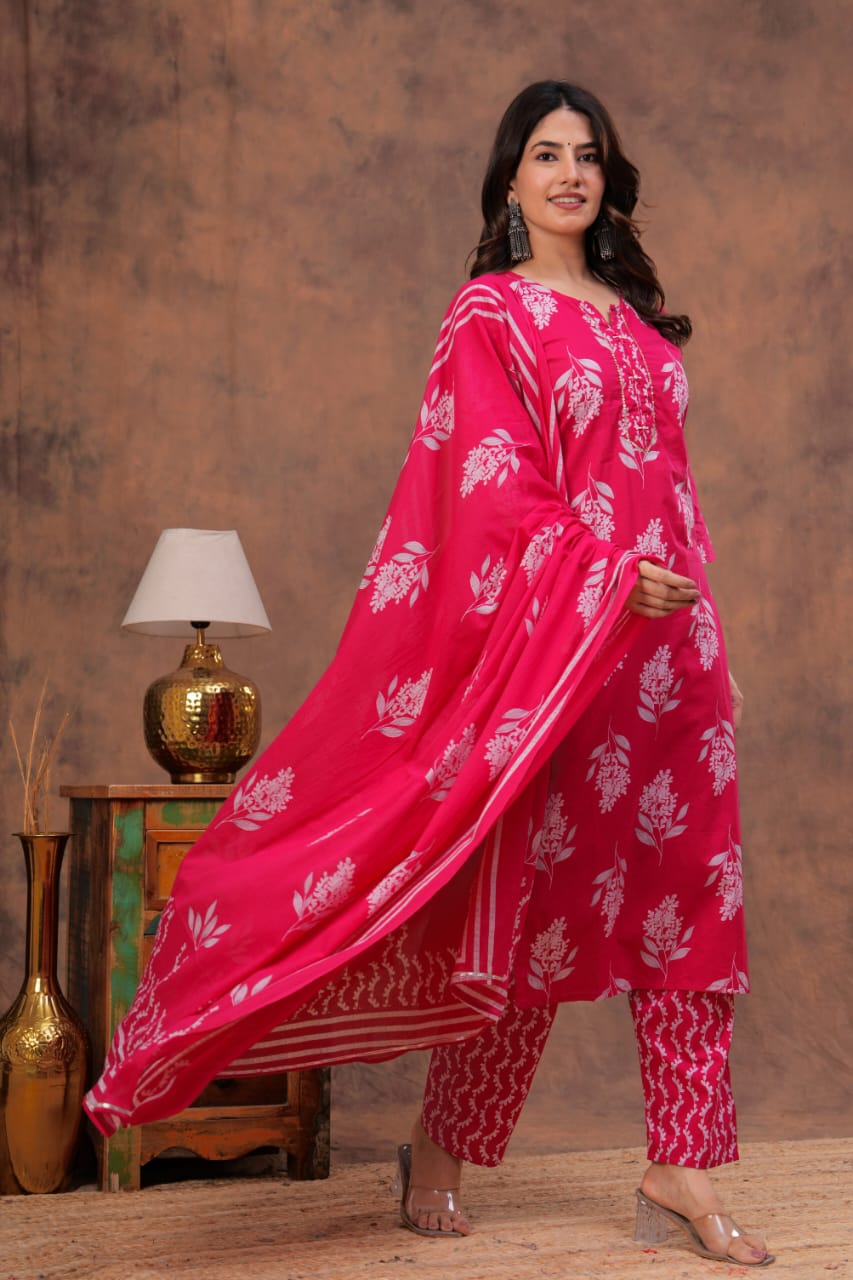 Rani Pink Floral Printed Indian Pakistani Traditional Cotton Straight Salwar Kameez Kurti Pant Dupatta Set - Set of 3