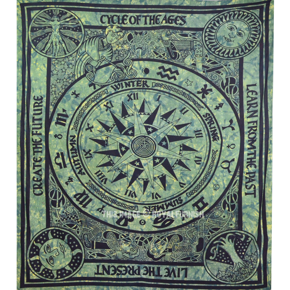 Green Mystical Astrological Cycle of Ages Tapestry Horoscope Zodiac Sign Wall Hanging Mandala Wall Tapestry
