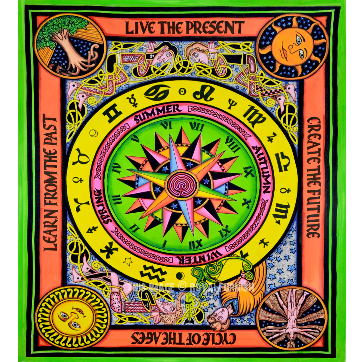 The Cycle of ages tapestry features traditional western zodiac different signs which are cycle of astrological ages where 12 astrological ages are associated with 12 zodiac signs. Astrology is known for different symbols those helps to know past, present & future. It is 100% cotton full bed size tapestry bedding. Bordered by four meaningful inscriptions which read: Learn From The Past, Live The Present, Create The Future, Cycle Of The Ages. Truly an inspirational work of art!