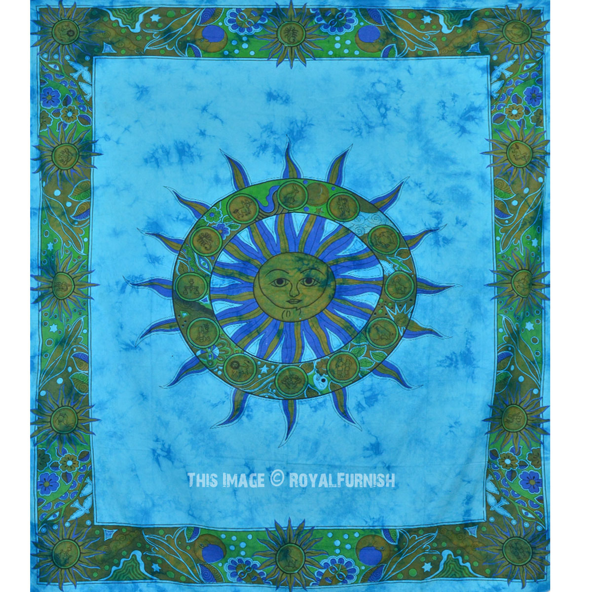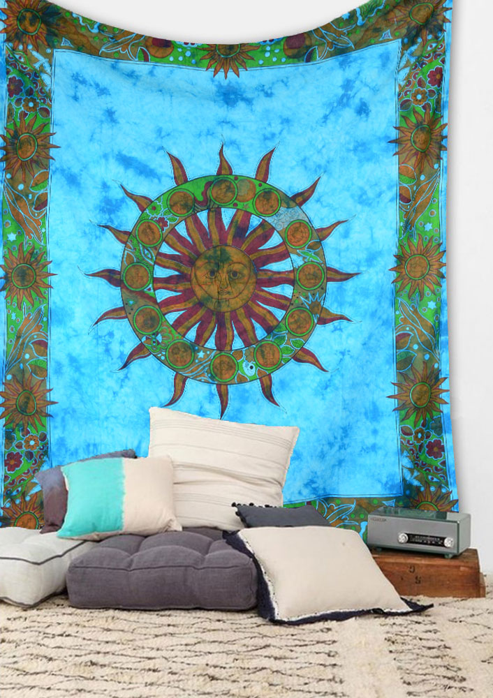Turquoise Blue Multi Psychedelic Sun & Moon Tapestry Celestial Energy Mystic Indian Wall Hanging