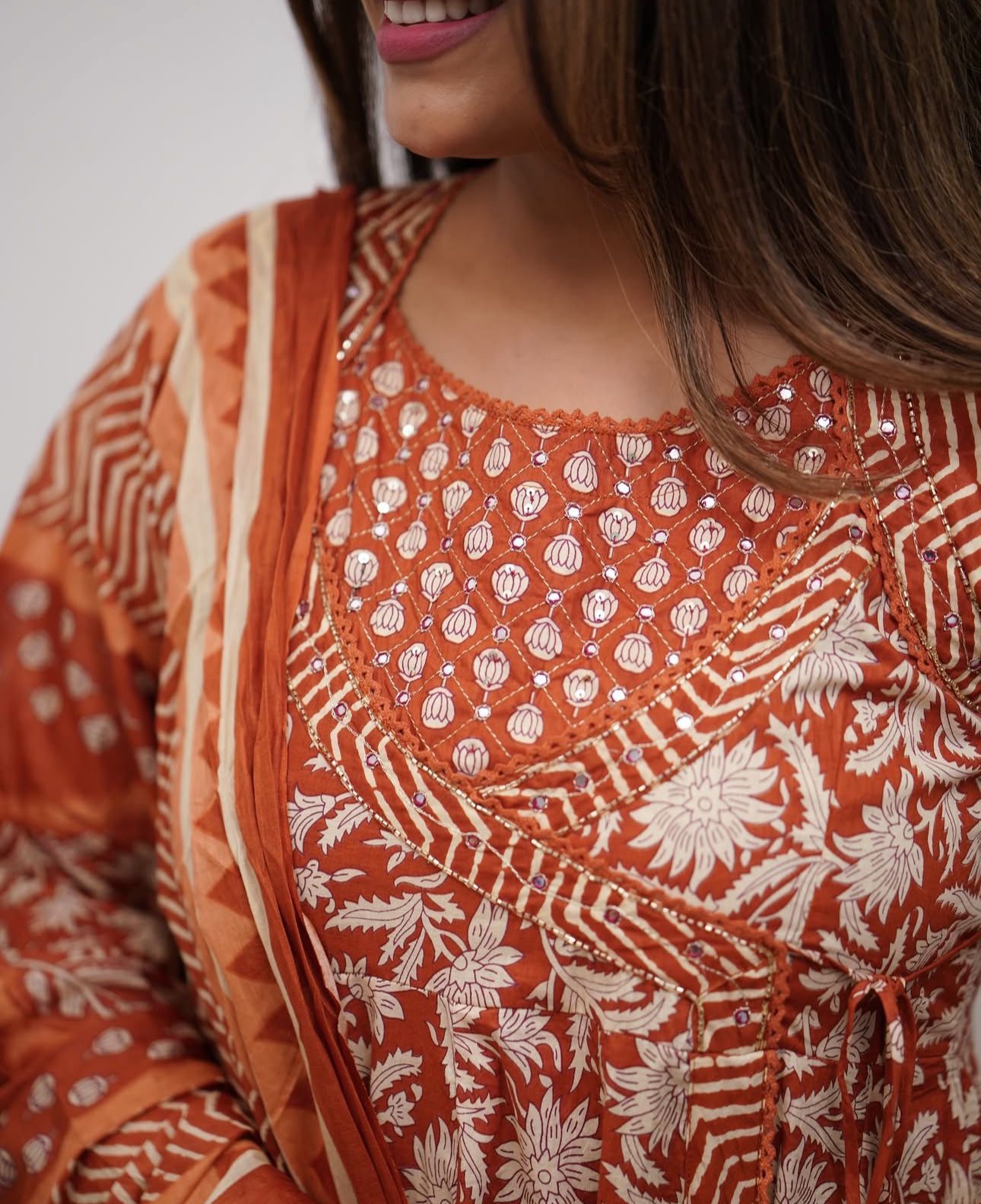 Elevate your ethnic style with this Floral Print Frock-Style Anarkali Set. Featuring a flowy kurta with intricate prints, matching pants, and a graceful dupatta, this 3-piece ensemble blends elegance and comfort. Perfect for festive celebrations, weddings, or casual gatherings, its vibrant design and flattering silhouette make it a timeless addition to your wardrobe.