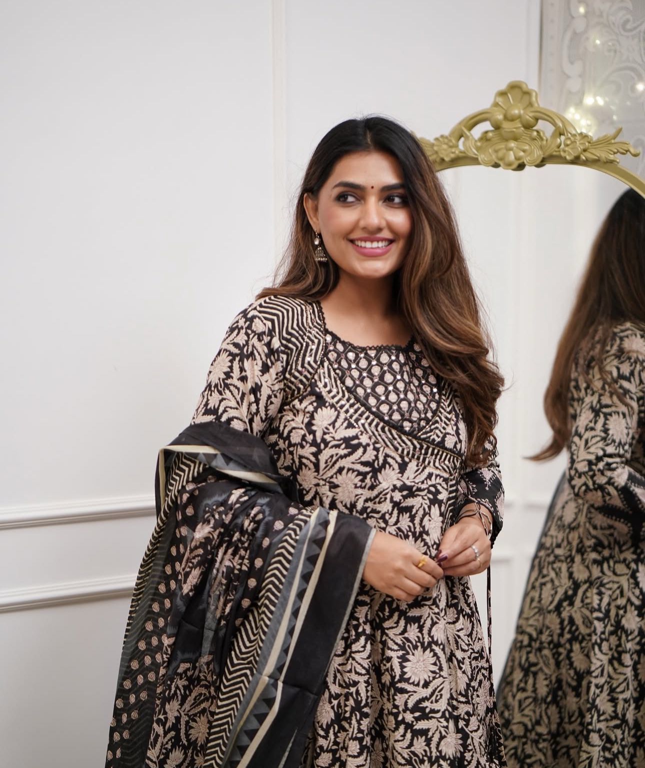 Black Floral Print Angrakha Style Frock Anarkali Kurta Kurti Pant Dupatta Set Gown Dress Salwar Kameez (Set of 3)