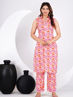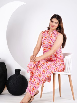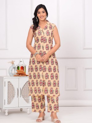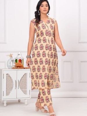 Cream Color Pakistani Indian Women Floral Cotton Salwar Kameez Kurti Pant Set