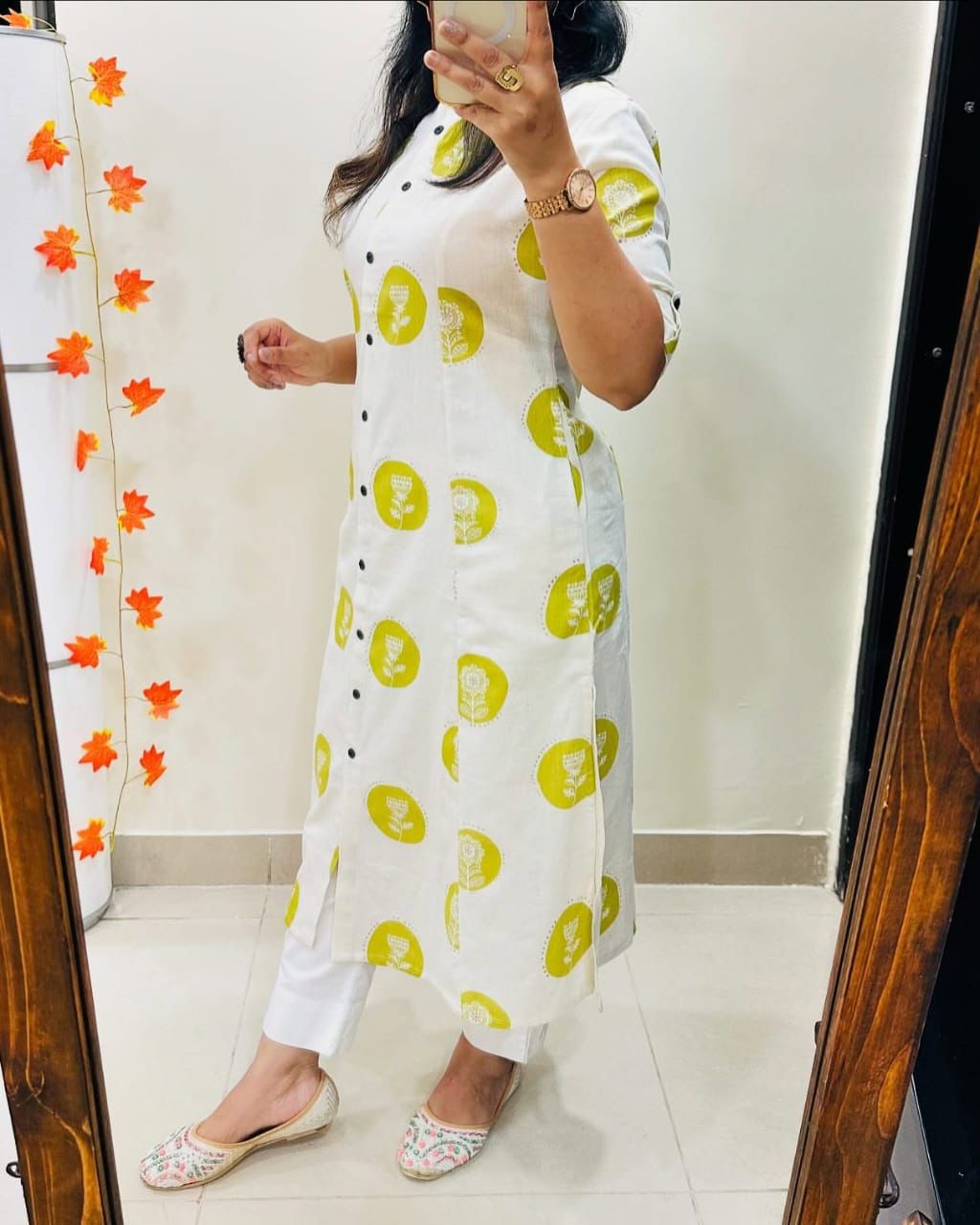 White Orange Round Block Print Indian A-Line Printed Cotton Salwar Kameez Kurti Pant Co Ord Set for Women (Set of 2)