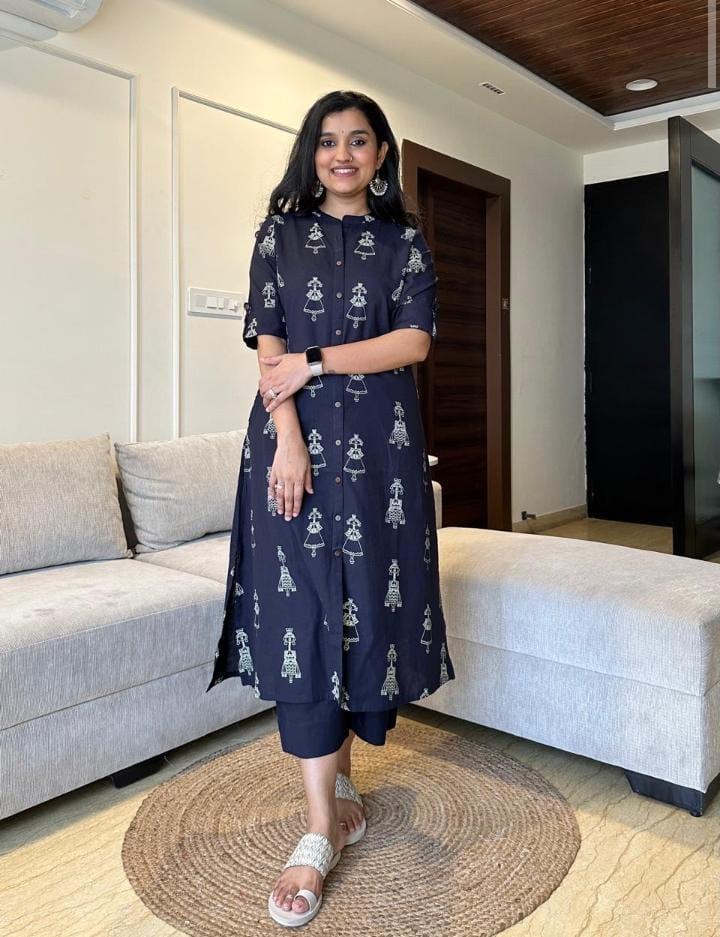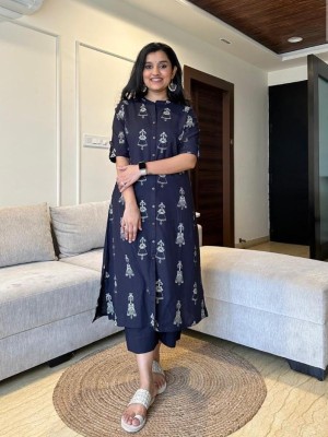 Navy Blue Printed A-Line Cotton Kurti Pant Salwar Kameez For Women - Set Of 2