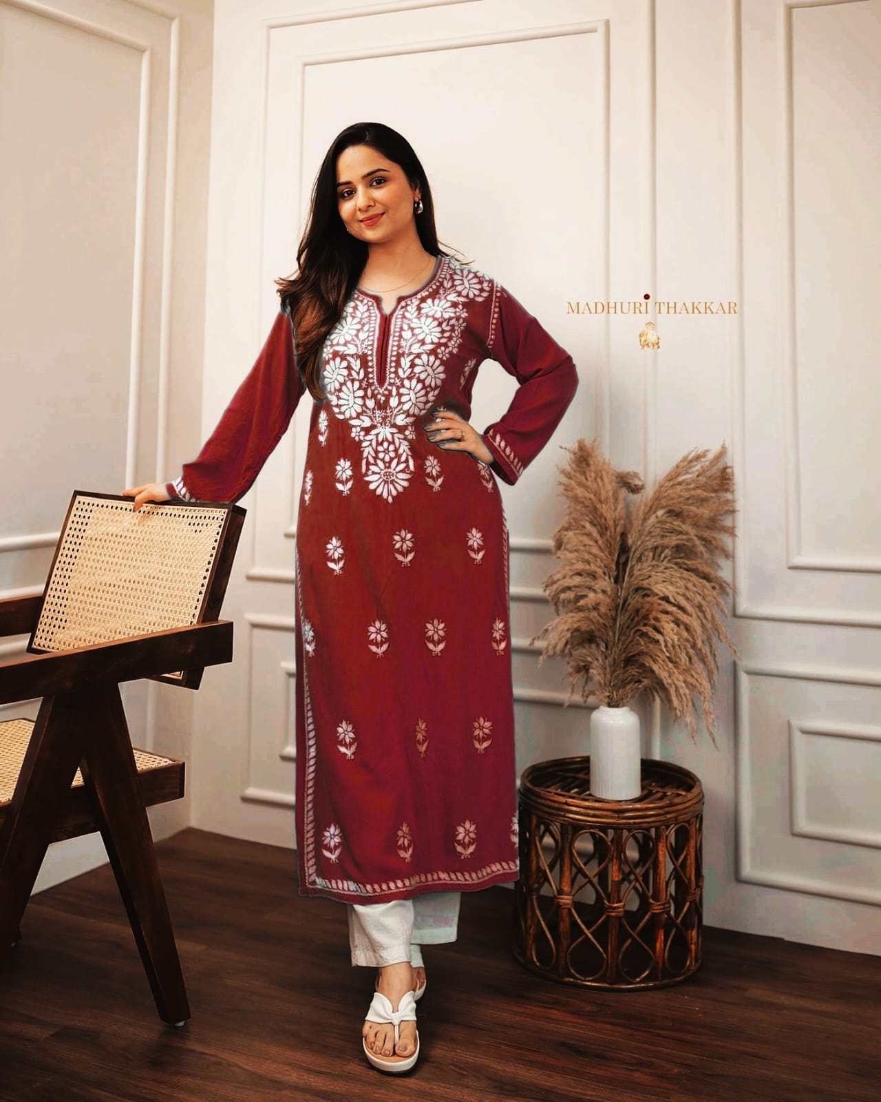 Maroon Floral Chikankari Embroidered Straight Cotton Kurti Pant Set Salwar Kameez for Women