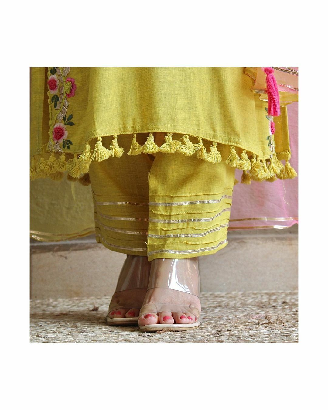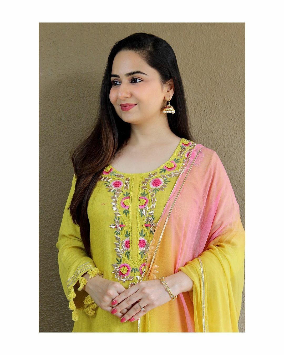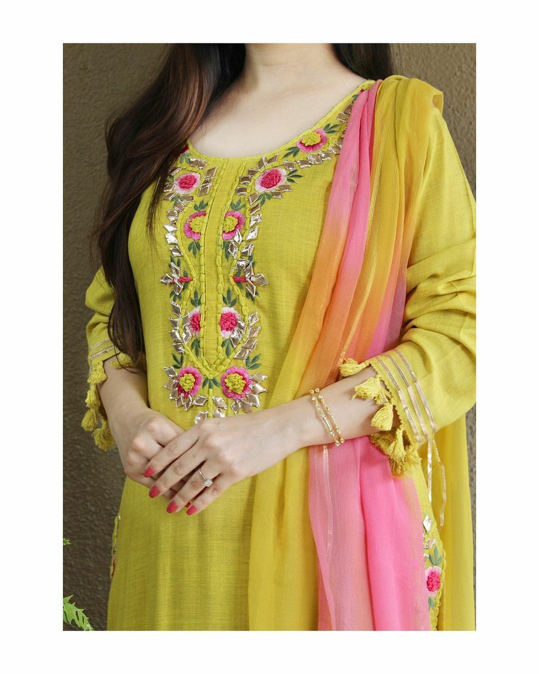 • Work: Heavy Embroidery Work on Kurti and Gota Work on Pant. Two Dye Color Chiffon Dupatta