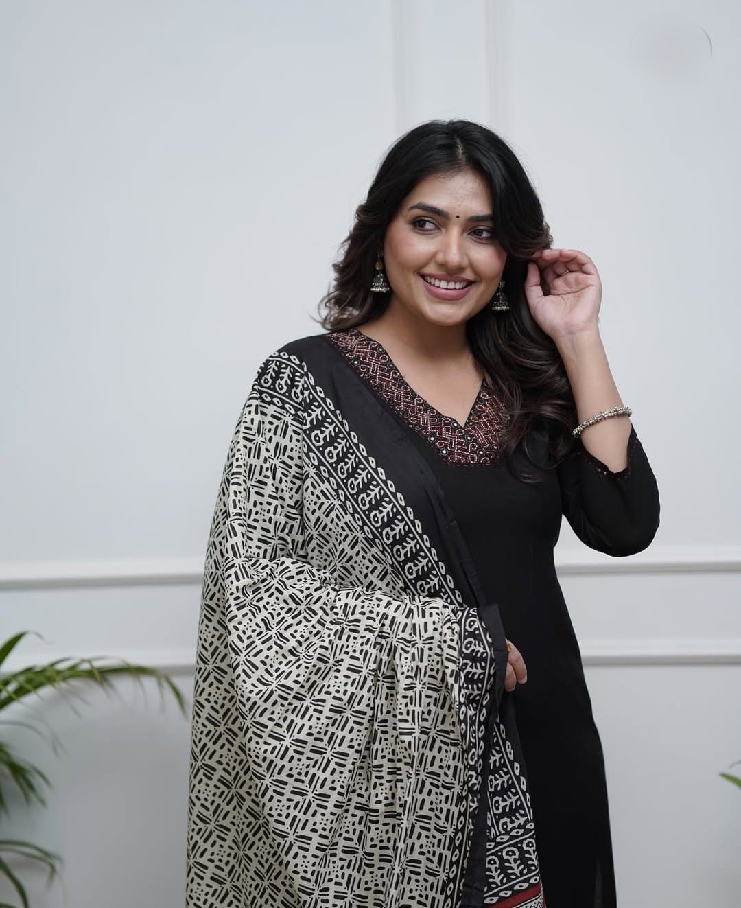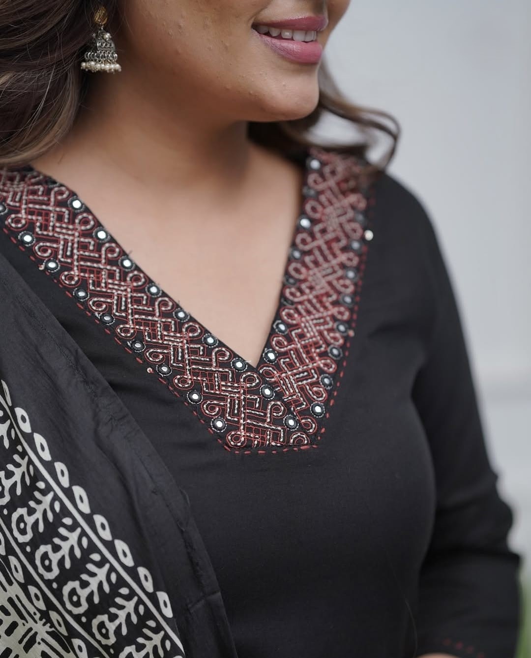 Black Embroidery Work On Neck Cotton Kurta Pant With Dupatta Salwar Kameez For Women (Set Of 3)