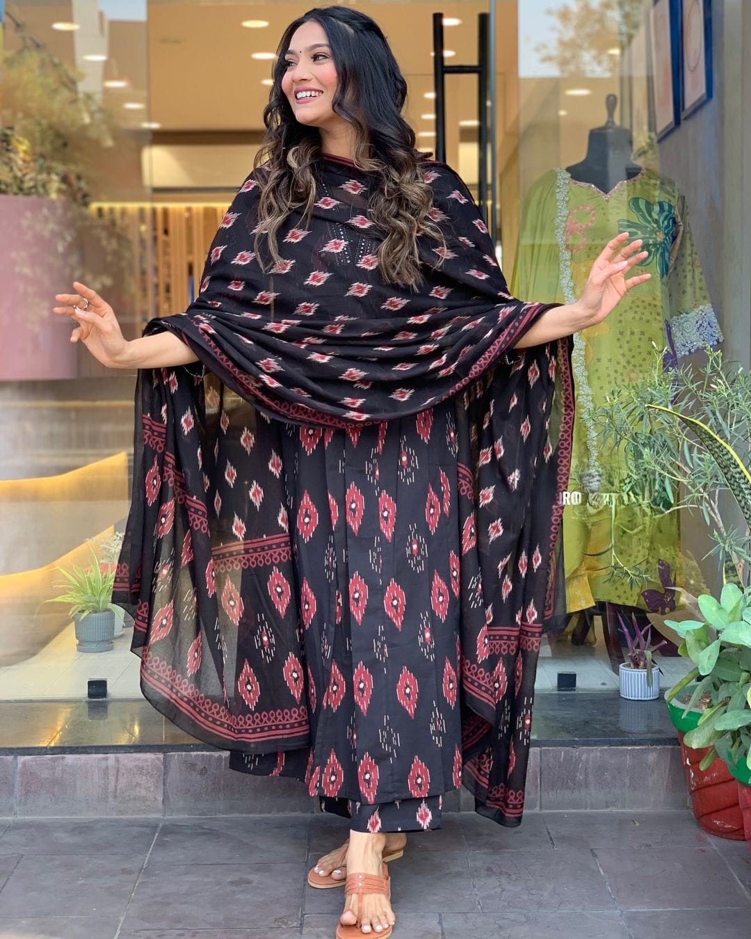 Black Ikkat Print Embroidery Work Cotton Kurta Pant With Dupatta Salwar Kameez For Women (Set Of 3)