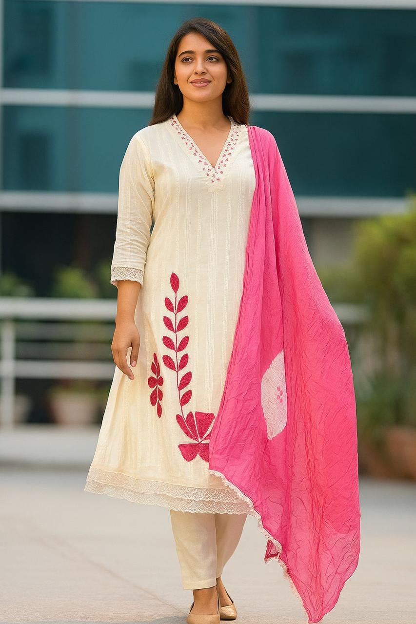 Elevate your ethnic wardrobe with this elegant Indian Pakistani Anarkali White Malmal Cotton Suit Set. Crafted from soft and breathable malmal cotton, it ensures all-day comfort with a graceful flow. The Anarkali kurti features a flared silhouette enhanced with delicate pink detailing, perfectly paired with matching cotton pants for a balanced traditional look. A beautifully designed dupatta completes the set, adding charm and sophistication. Ideal for festive gatherings, family functions, or casual outings, this salwar kameez combines timeless tradition with modern simplicity. Stay stylish and comfortable with this versatile Anarkali suit, a must-have addition to your ethnic collection.