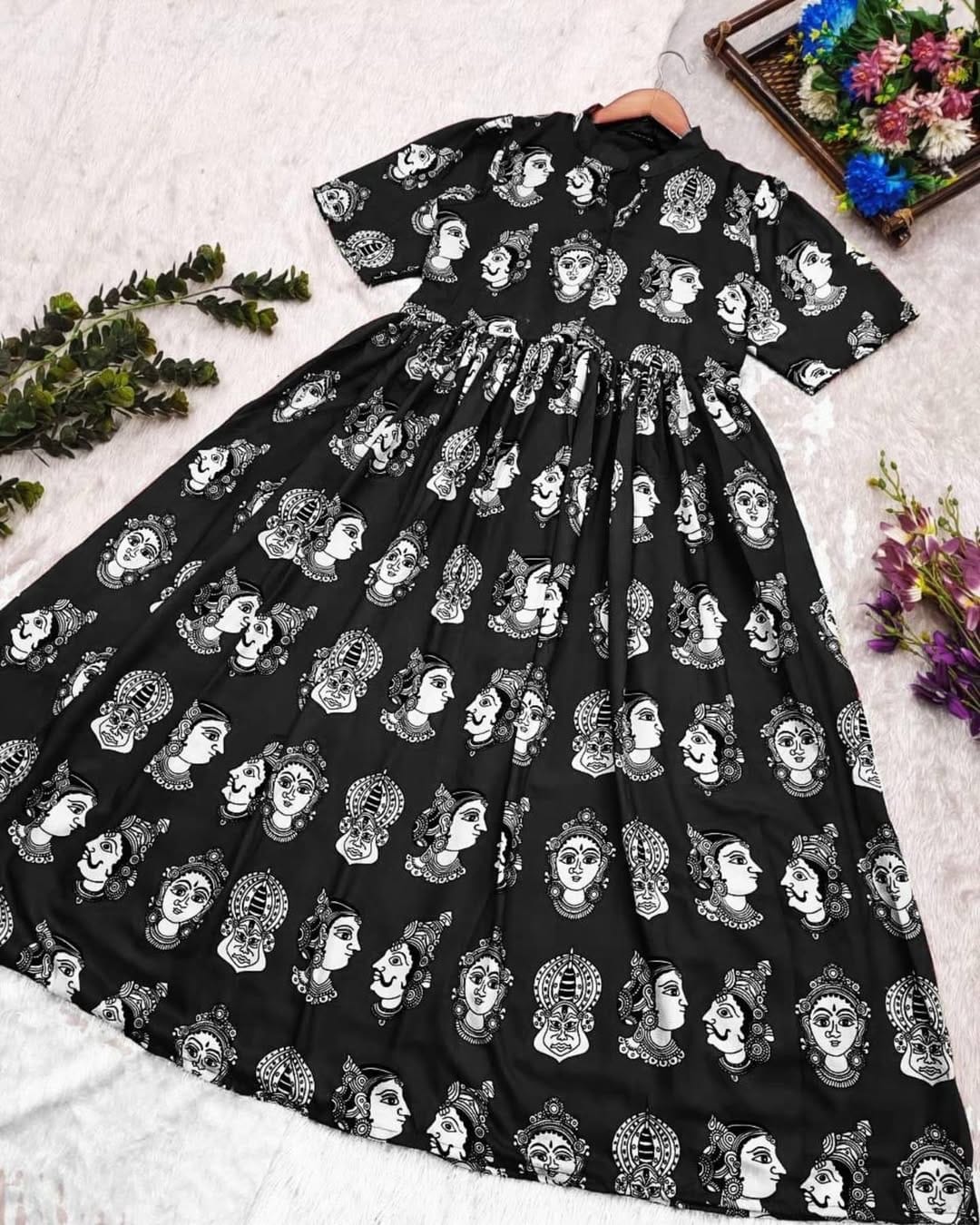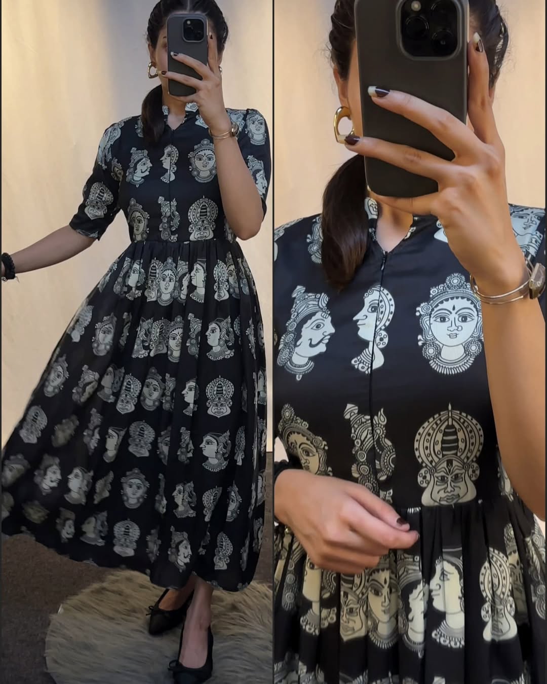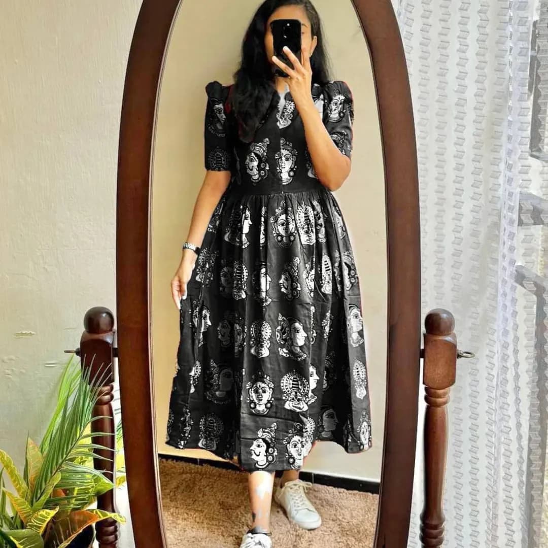 Black Beautiful Madhubani Printed Half Sleeves Cotton Flare Midi Kurti Gown Dress For Women