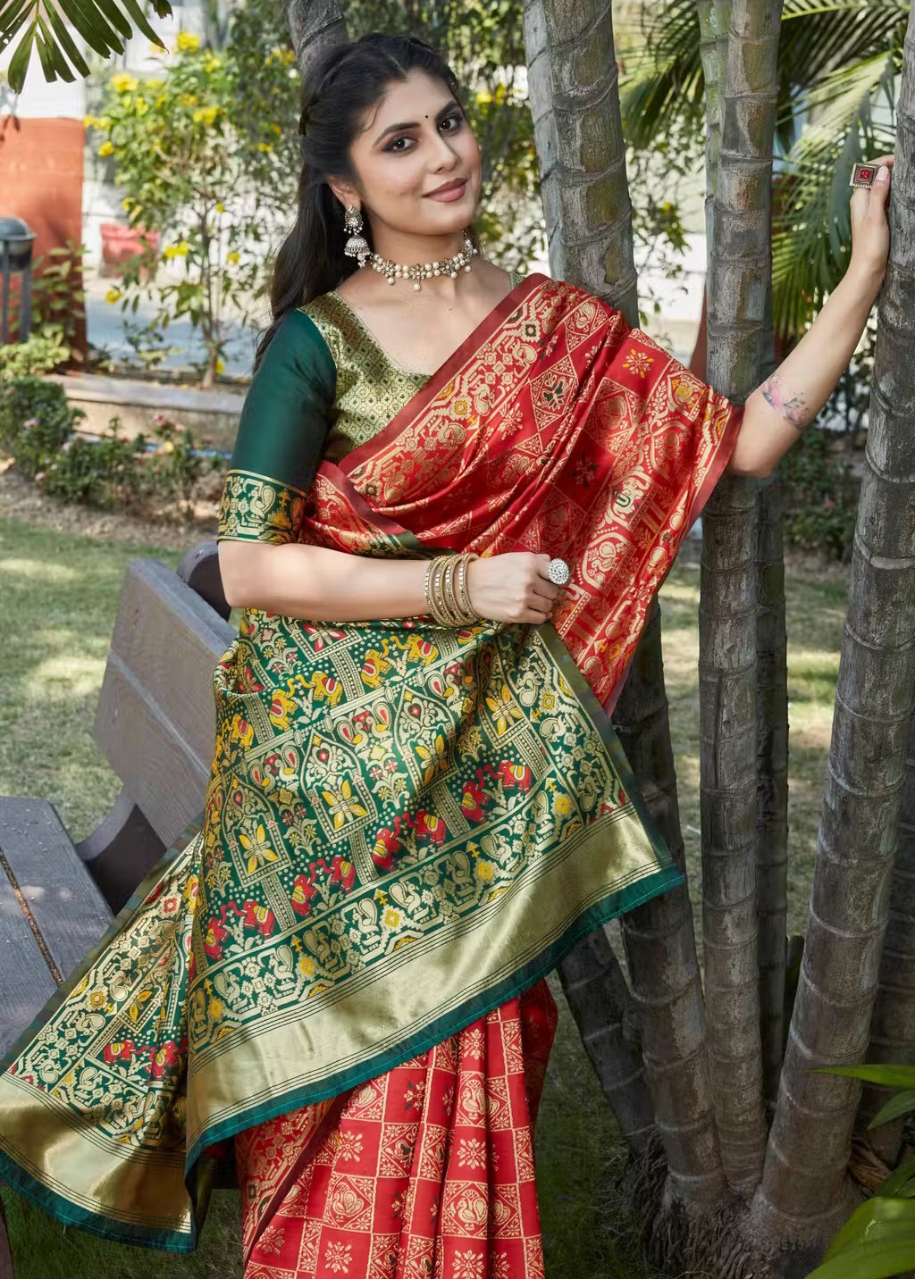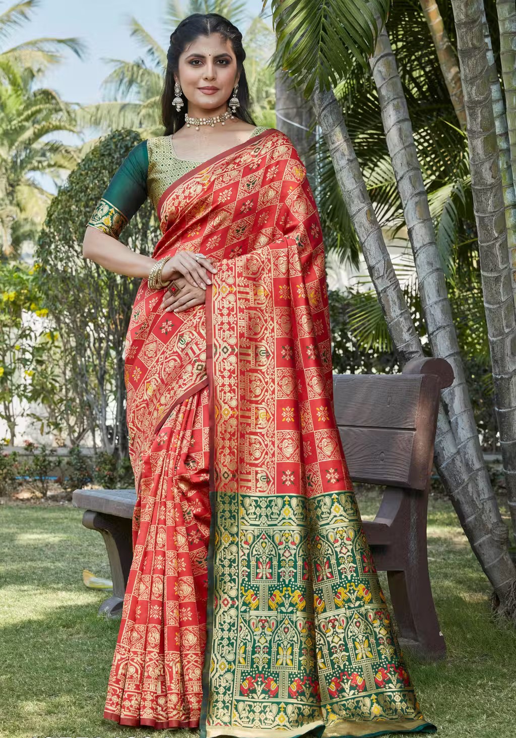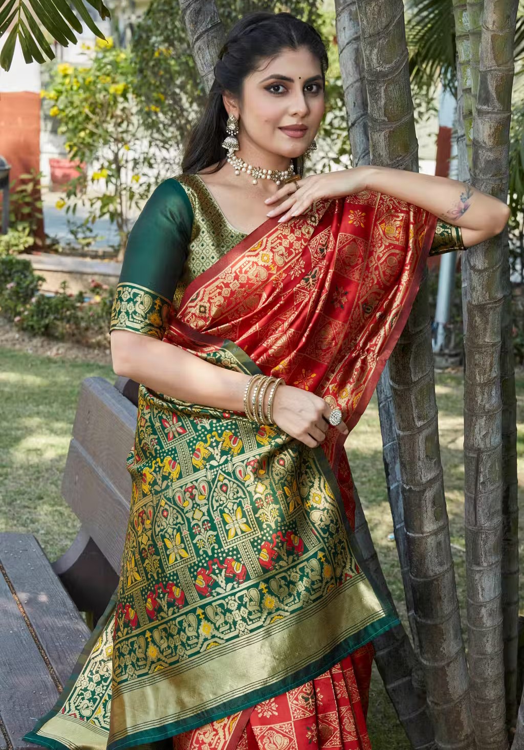Red & Green Designer Women Multi colored Kanjivaram Silk Party Wear Banarasi Silk Jacquard Pattu Saree