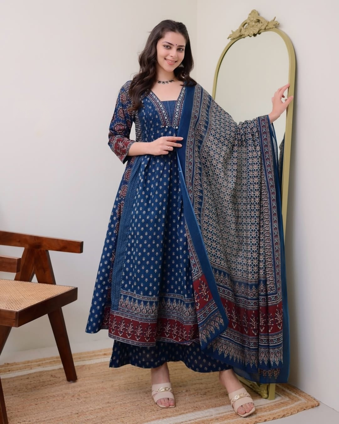 Step into elegance with our Blue Embroidered Anarkali Kurta Pant Dupatta Set. This set of three features a stunning Anarkali kurta, beautifully adorned with intricate embroidery that adds a touch of sophistication, the flowy silhouette ensures a flattering fit, while the coordinating pants and dupatta complete the look. Crafted from high-quality rayon fabric, this gown-style salwar kameez is perfect for festive occasions or special events. Elevate your ethnic collection with this timeless and enchanting ensemble!