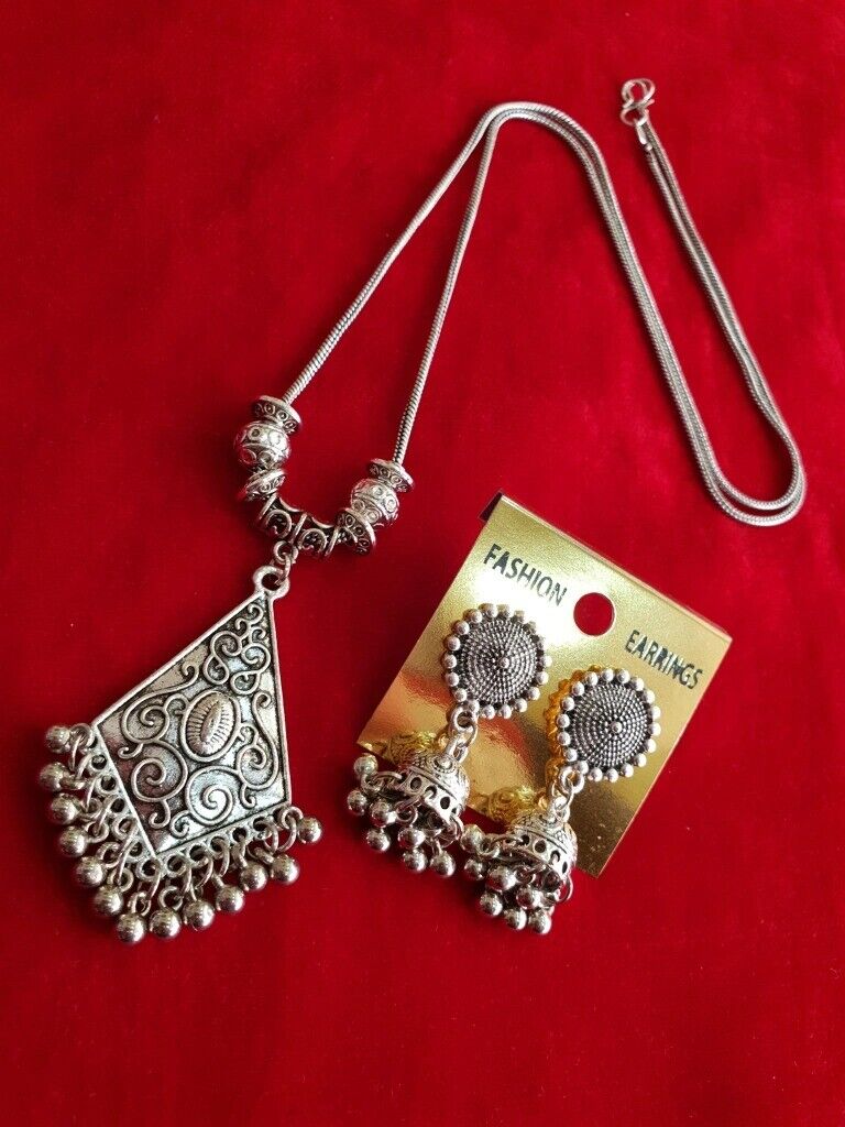 Diamond Shaped Pendant Necklace Earring Set Women Silver Plated Oxidized Chain Alloy