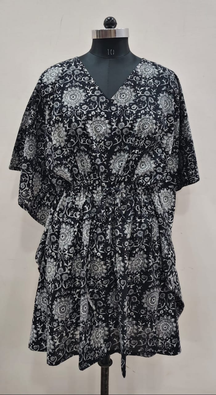 Black Free Size Cotton Hand Block Floral Printed Short Kaftan Maxi Summer Dress Beach Cover Up Boho Hippy Tunic