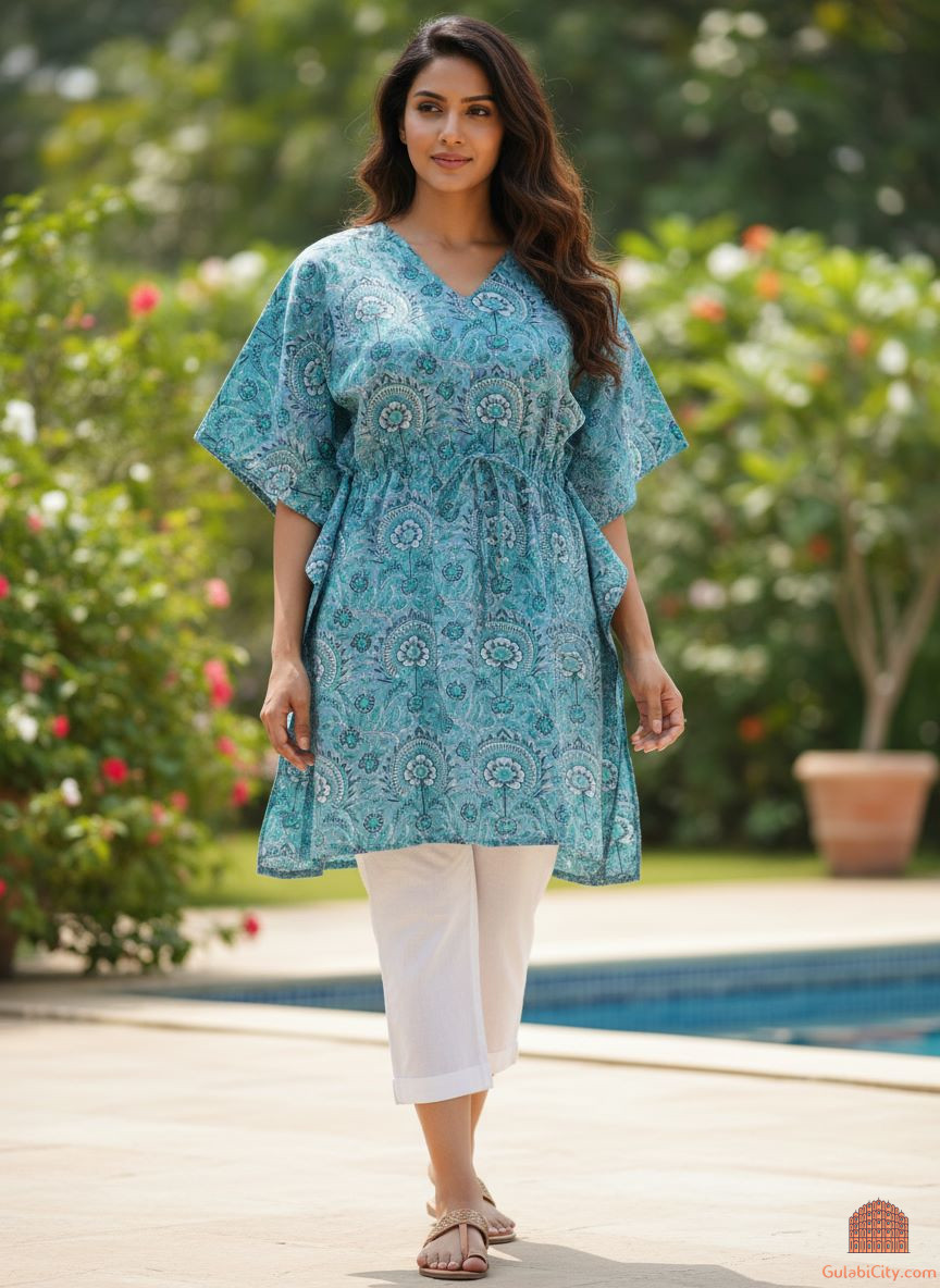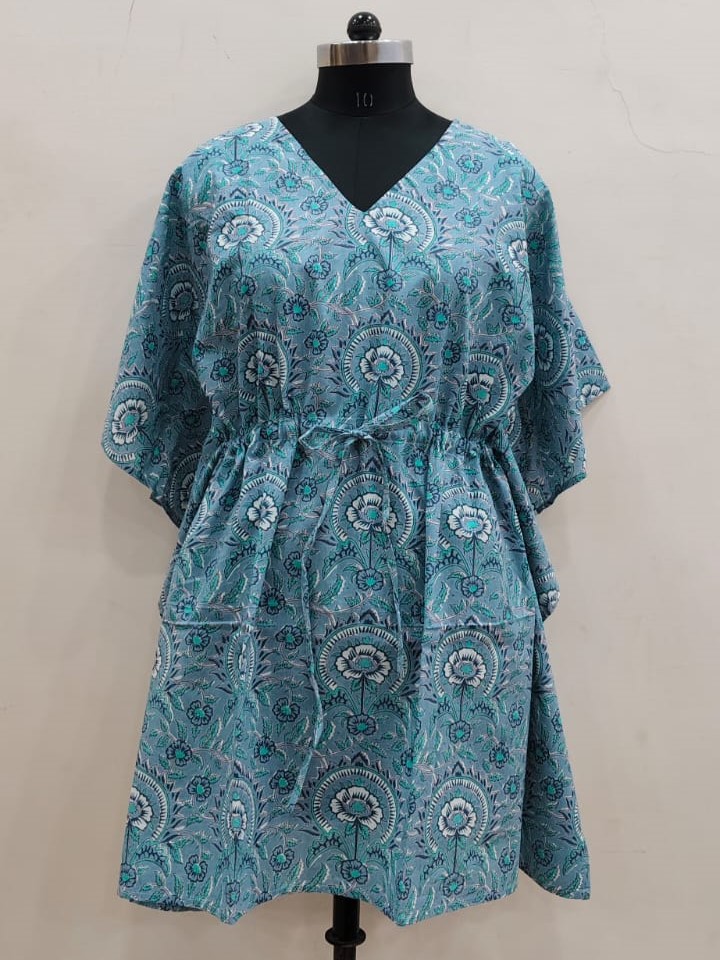Stay stylish and comfortable with this Free Size Cotton Hand Block Floral Printed Short Kaftan. Perfect as a maxi summer dress, beach cover up, or boho hippy tunic, it offers a relaxed fit with breathable cotton fabric. The hand block floral design adds charm, making it an ideal choice for casual outings, vacations, or lounging in effortless elegance.