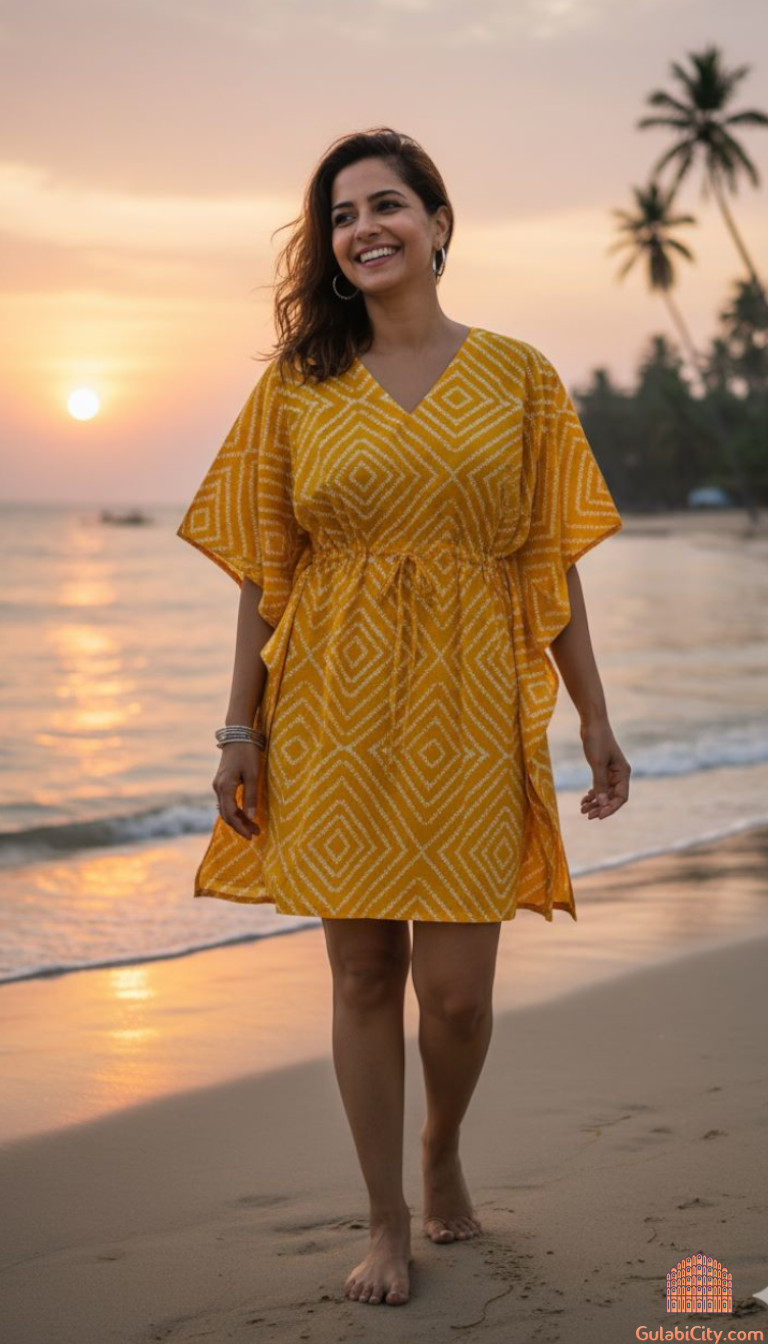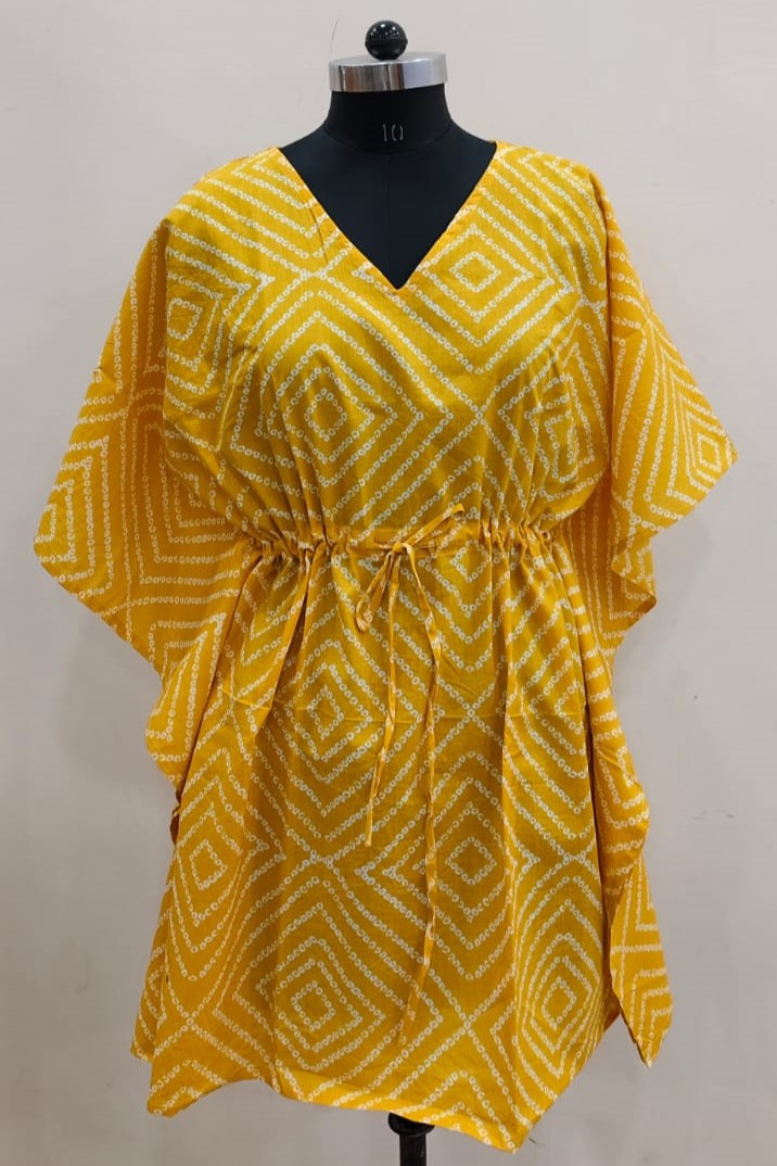 Stay stylish and comfortable with this Free Size Cotton Printed Short Kaftan. Perfect as a maxi summer dress, beach cover up, or boho hippy tunic, it offers a relaxed fit with breathable cotton fabric. The printed design adds charm, making it an ideal choice for casual outings, vacations, or lounging in effortless elegance.
