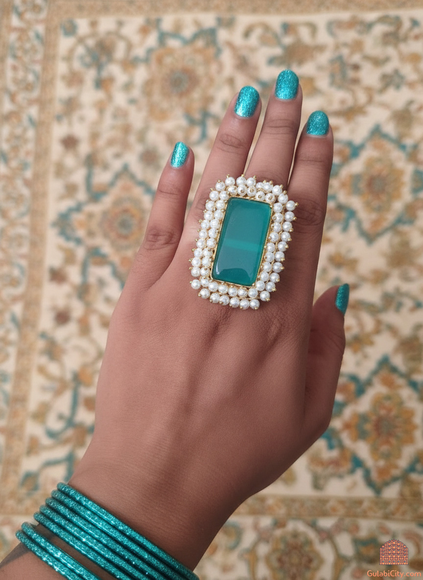 Aqua Ethnic Indian Handcrafted Pearl Work Ring Designer Big Size Monalisa Stone Beaded Adjustable Finger Ring