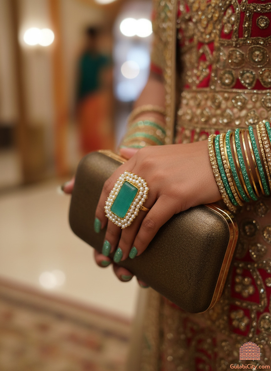 Mint Ethnic Indian Handcrafted Pearl Work Ring Designer Big Size Monalisa Stone Beaded Adjustable Finger Ring
