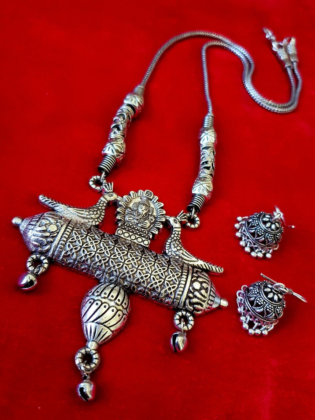 Royal Designer Idol Ganesha Pendant Idol Necklace with Jhumka Set Silver Plated Oxidized Chain Alloy