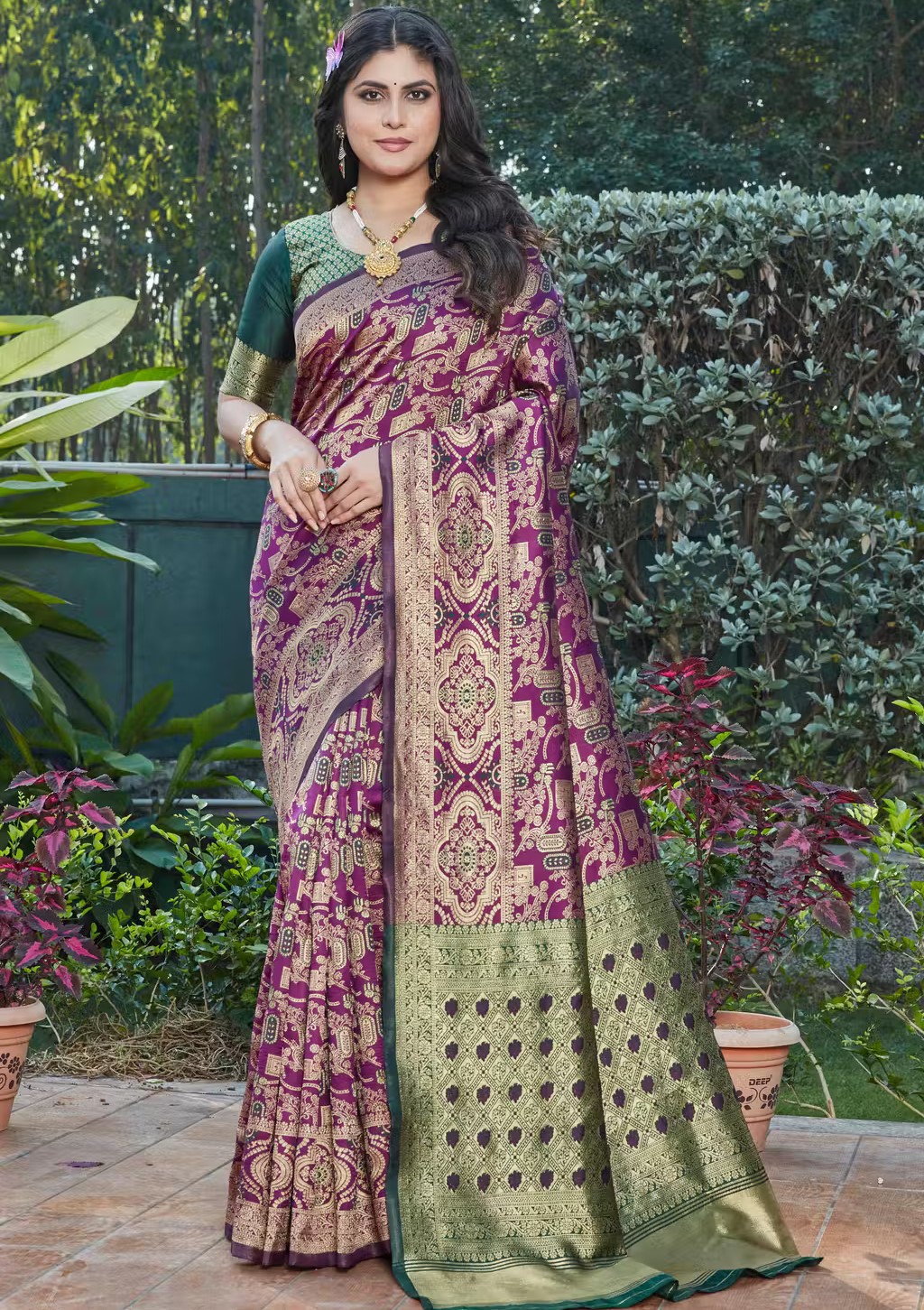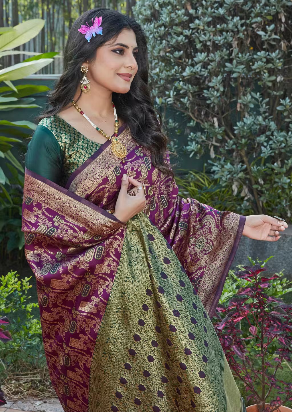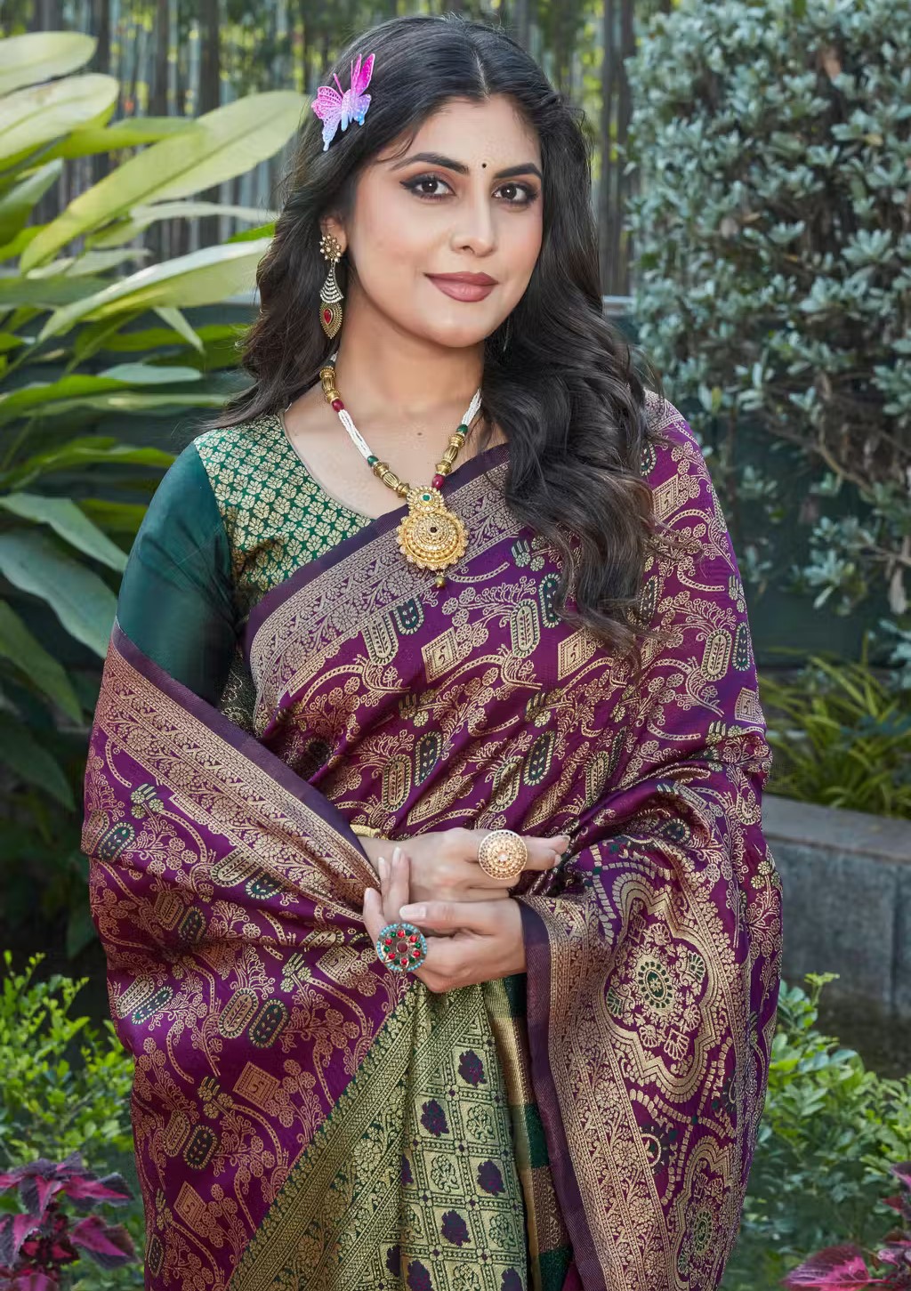 Purple & Green Jacquard Art Banarasi Silk Saree Premium Indian Traditional Wear Ethnic Look with Blouse Piece