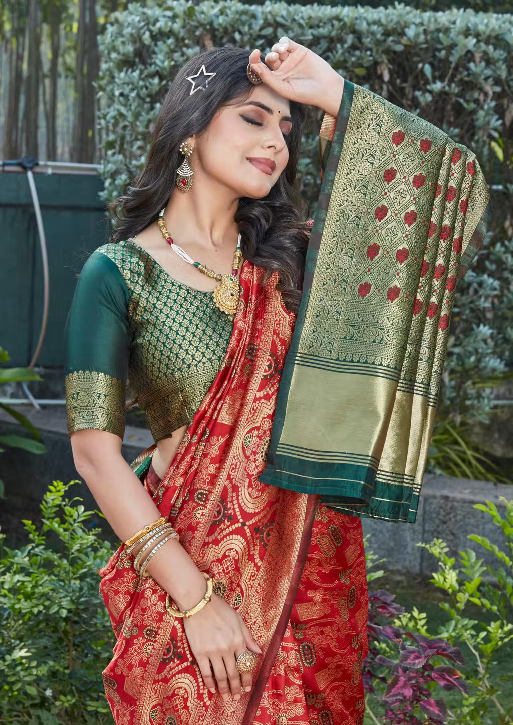 Red & Green Luxurious Pure Banarasi Silk Jacquard Woven Designer Saree Traditional Indian Festive Wear Saree