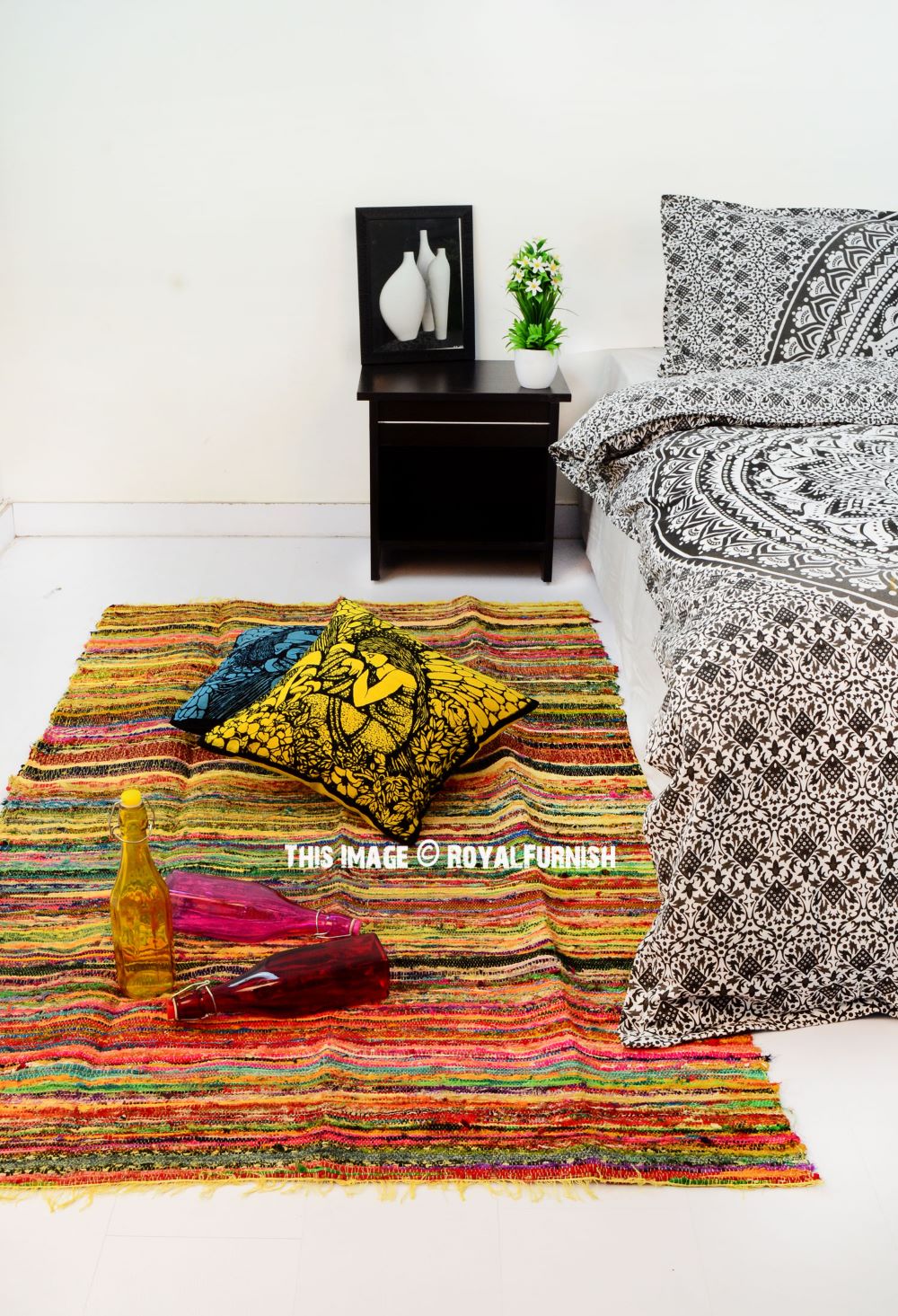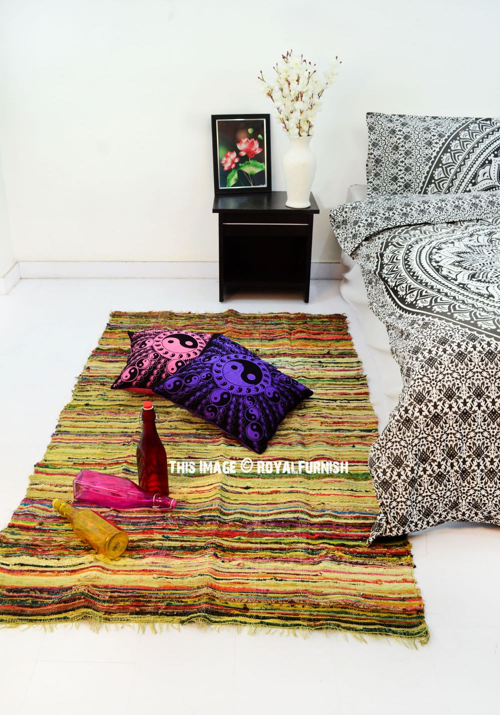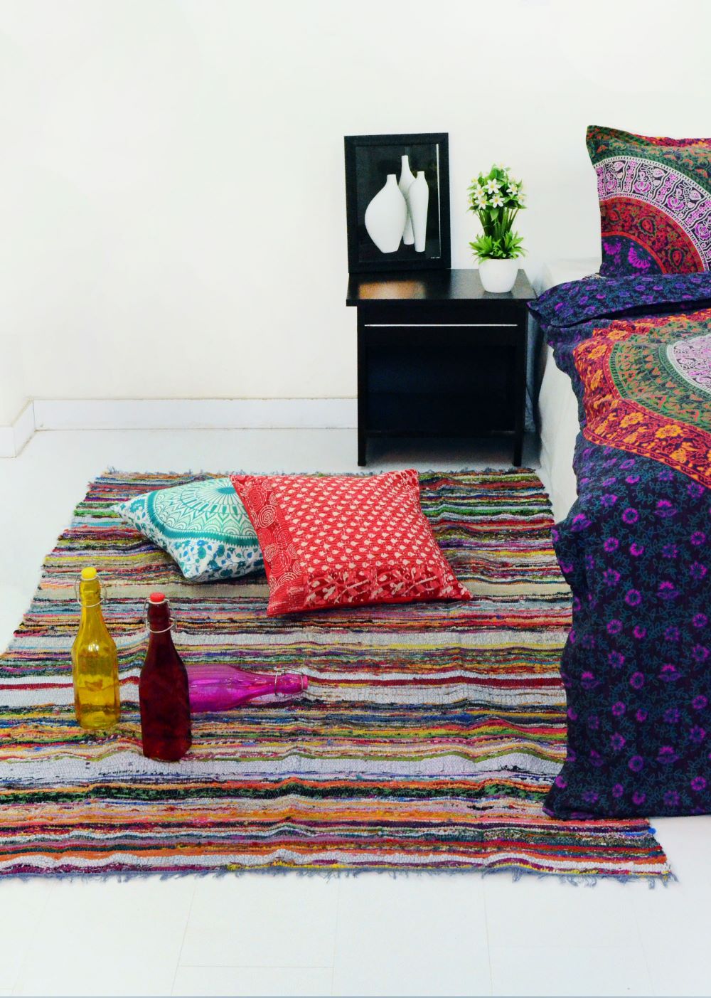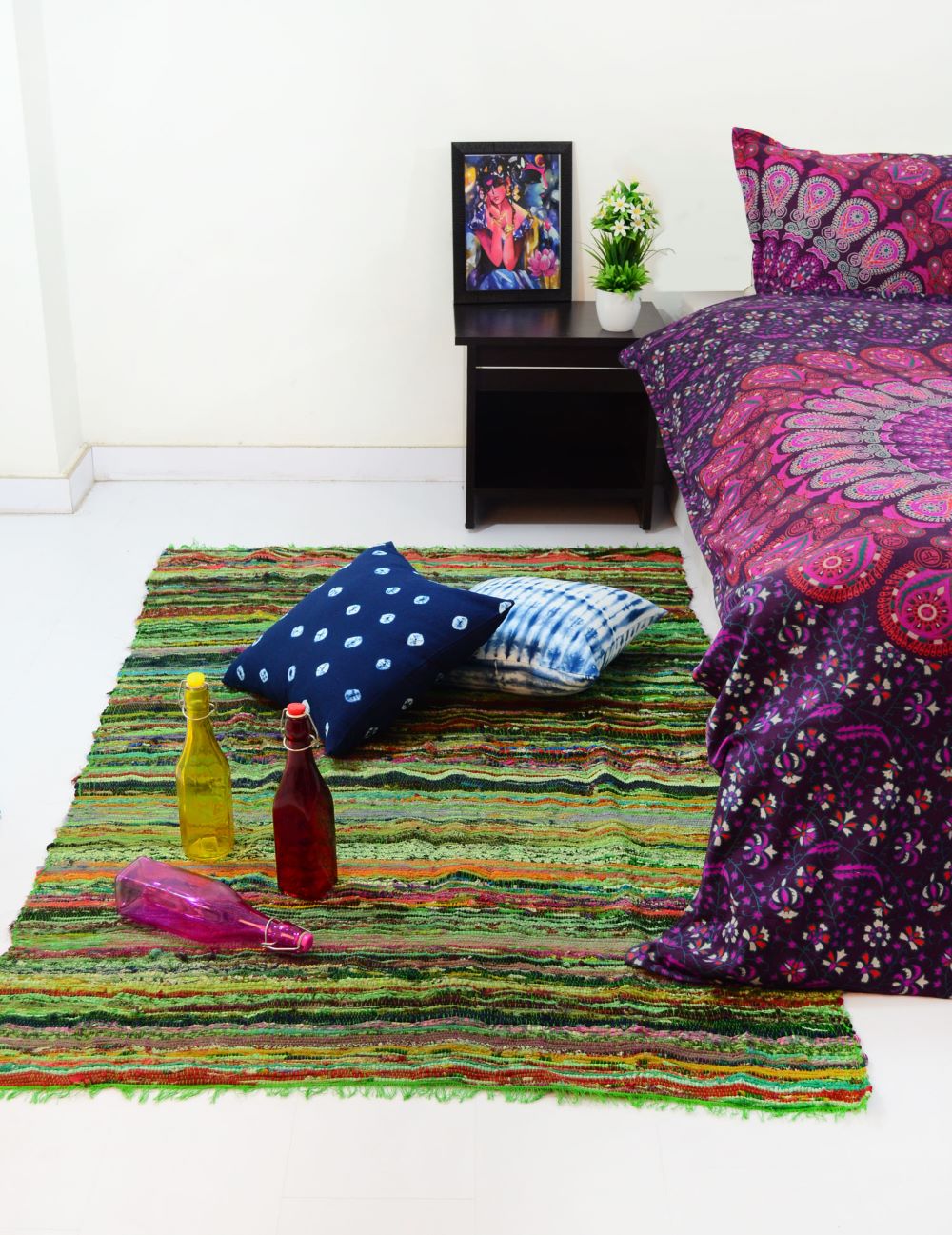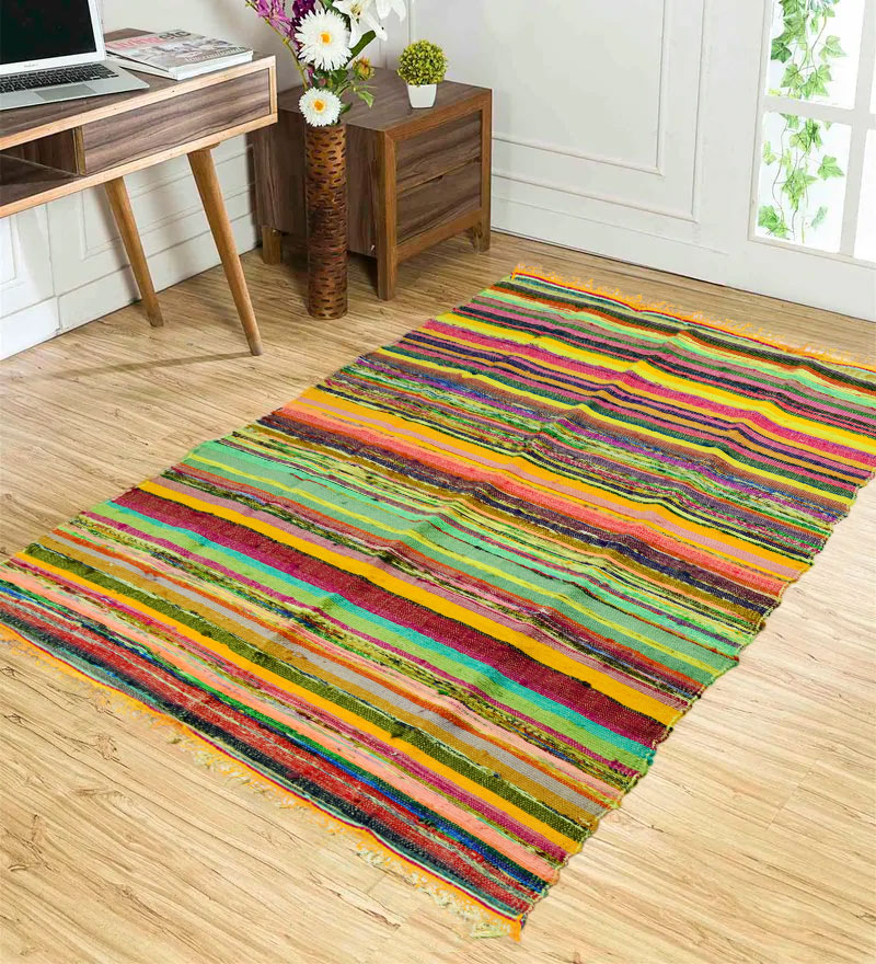 Give bare floors a quick & easy makeover with Chindi rag rug. It is made of recycled old fabric which is loomed by weaver in India. It comes into multiple colors striped design due to multicolored recycled fabrics. It will set the tone, color scheme and comfort to your living space or bedroom. Each Chindi rug is unique in itself due to multiple fabric used to make it.