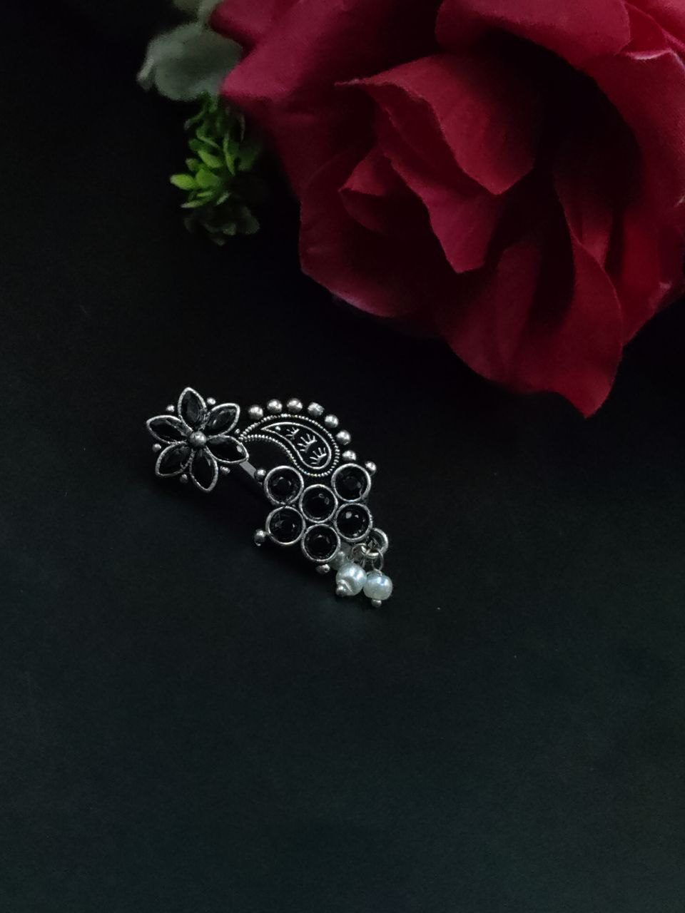 Black Antique Paisley Designer Marathi Nath Silver Plated Maharashtrian Non-Piercing Adjustable Nose Pin
