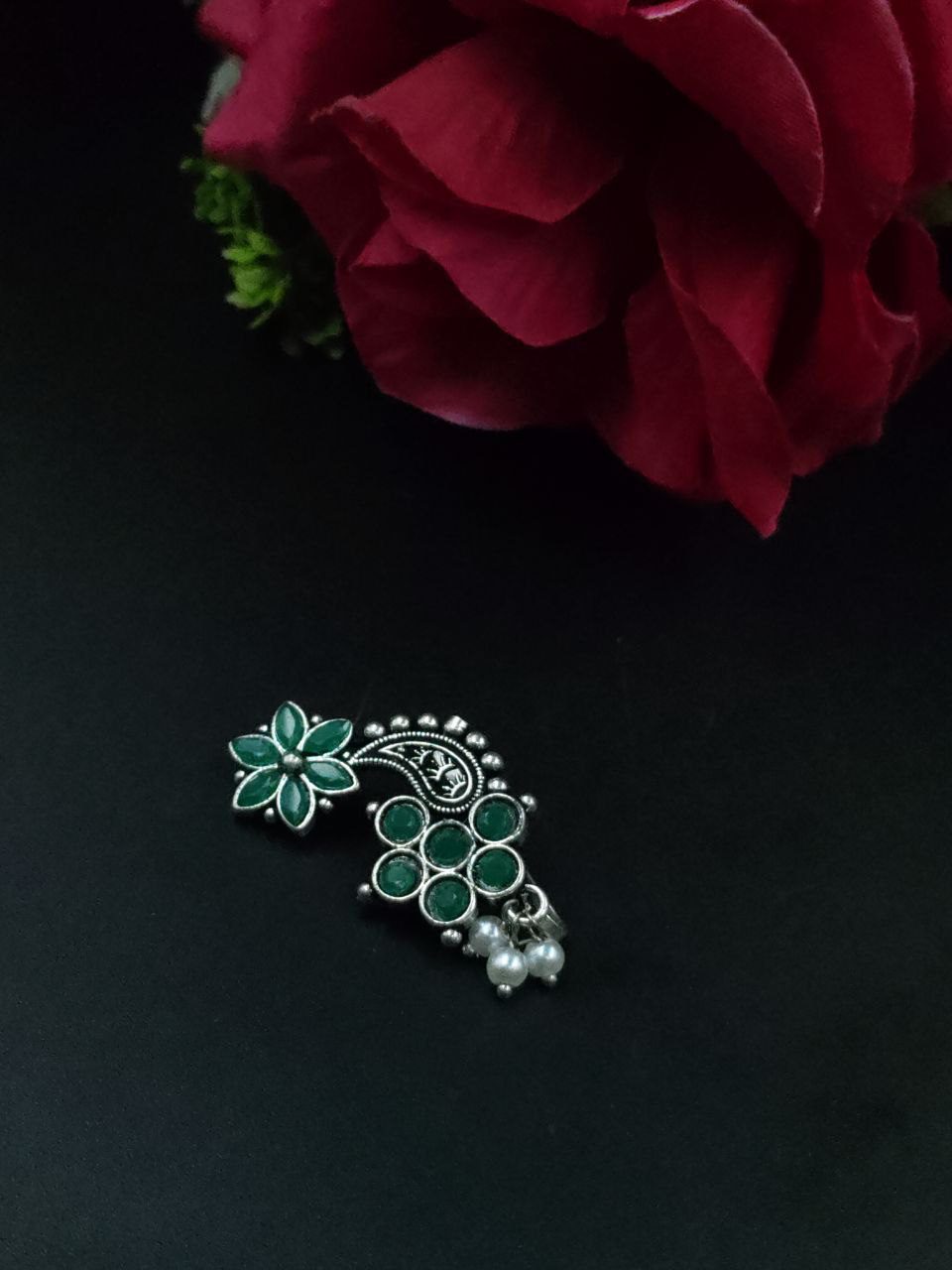 Green Antique Paisley Designer Marathi Nath Silver Plated Maharashtrian Non-Piercing Adjustable Nose Pin