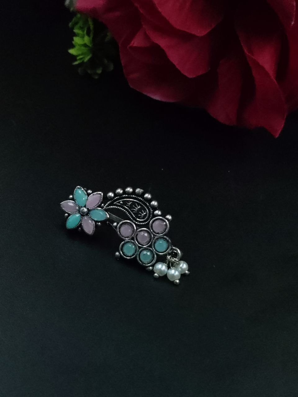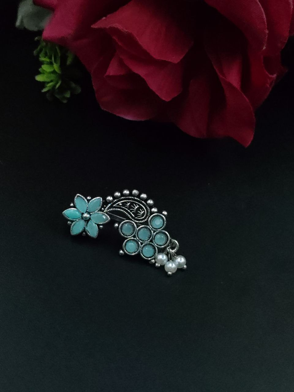 Aqua Antique Paisley Designer Marathi Nath Silver Plated Maharashtrian Non-Piercing Adjustable Nose Pin