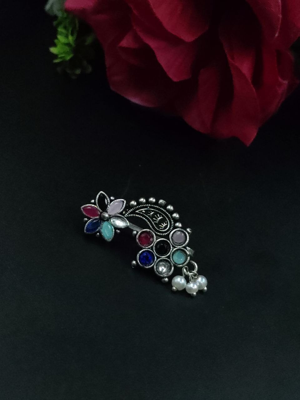 Multi Antique Paisley Designer Marathi Nath Silver Plated Maharashtrian Non-Piercing Adjustable Nose Pin