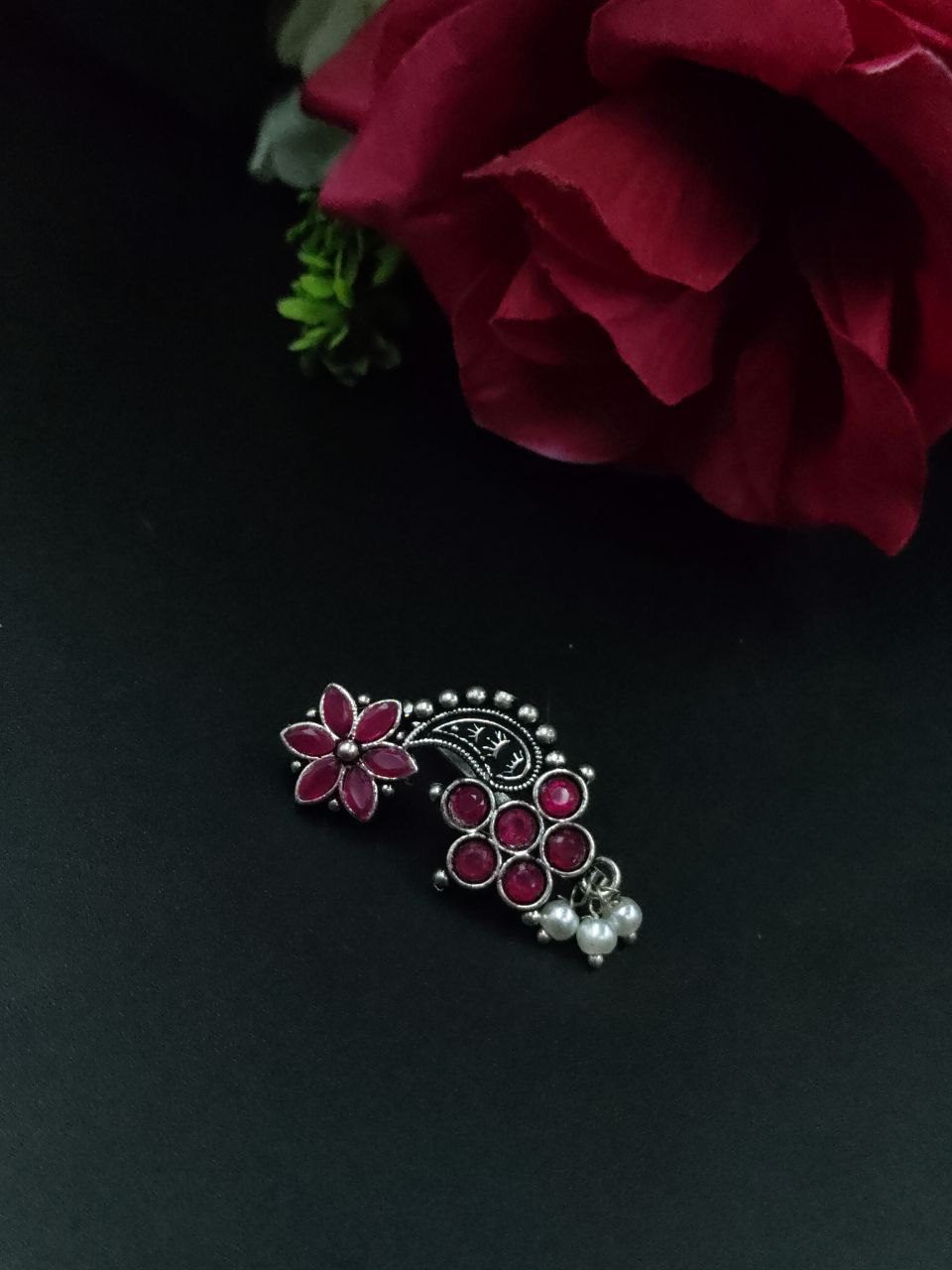 Red Antique Paisley Designer Marathi Nath Silver Plated Maharashtrian Non-Piercing Adjustable Nose Pin