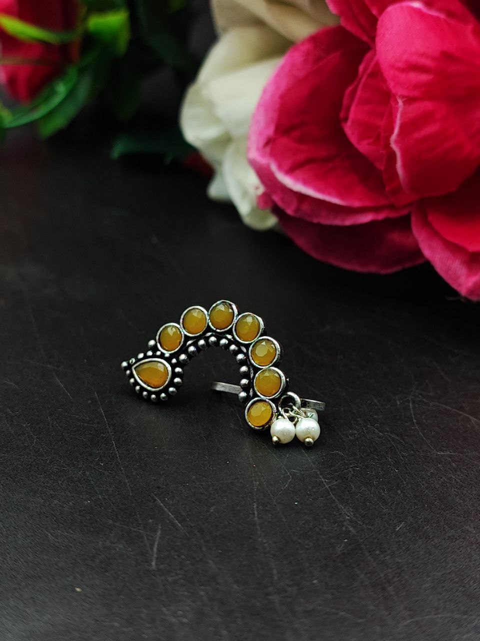 Yellow Stunning Oxidized Silver Marathi Nath Ethnic Stone Crafted Non-Piercing Nose Pin with Pearl Drops