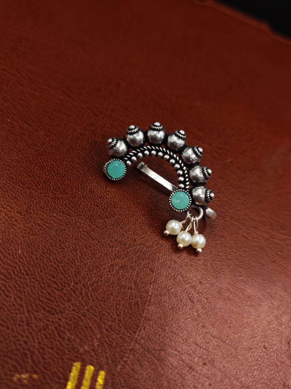 Green Traditional Silver Oxidized Marathi Nath Ethnic Maharashtrian Non-Piercing Nose Pin with Pearl Drops