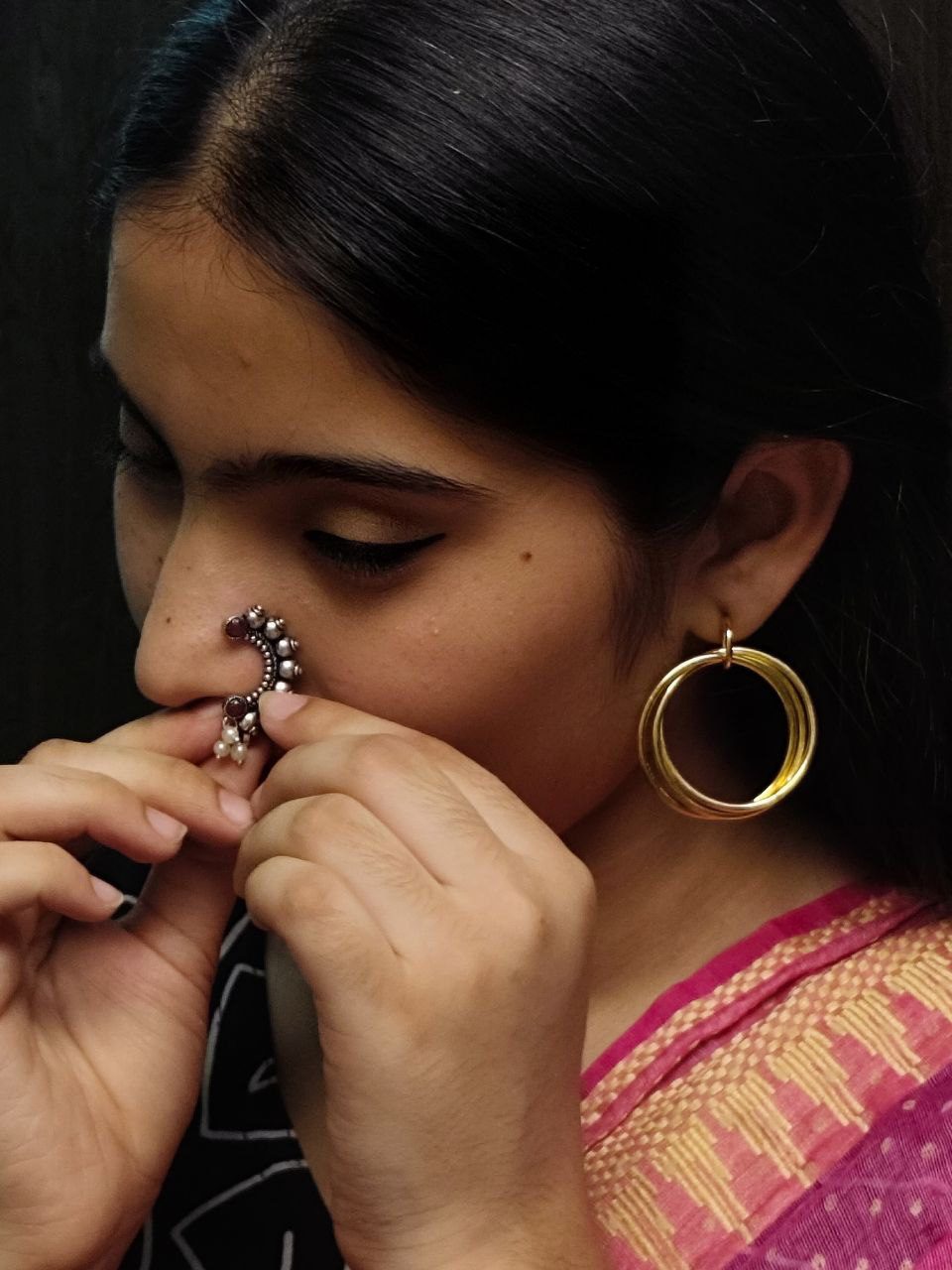 Pink Traditional Silver Oxidized Marathi Nath Ethnic Maharashtrian Non-Piercing Nose Pin with Pearl Drops