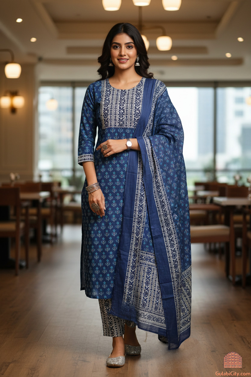 Embrace timeless elegance with this Blue Floral Printed Indian Straight Cotton Salwar Kameez Set. Crafted from soft, breathable cotton, it ensures all-day comfort and effortless style. The beautiful floral prints add a touch of grace, while the straight-cut kurti pairs perfectly with matching pants and a lightweight dupatta. Ideal for festive occasions, casual outings, or daily wear, this set blends tradition with modern charm effortlessly.