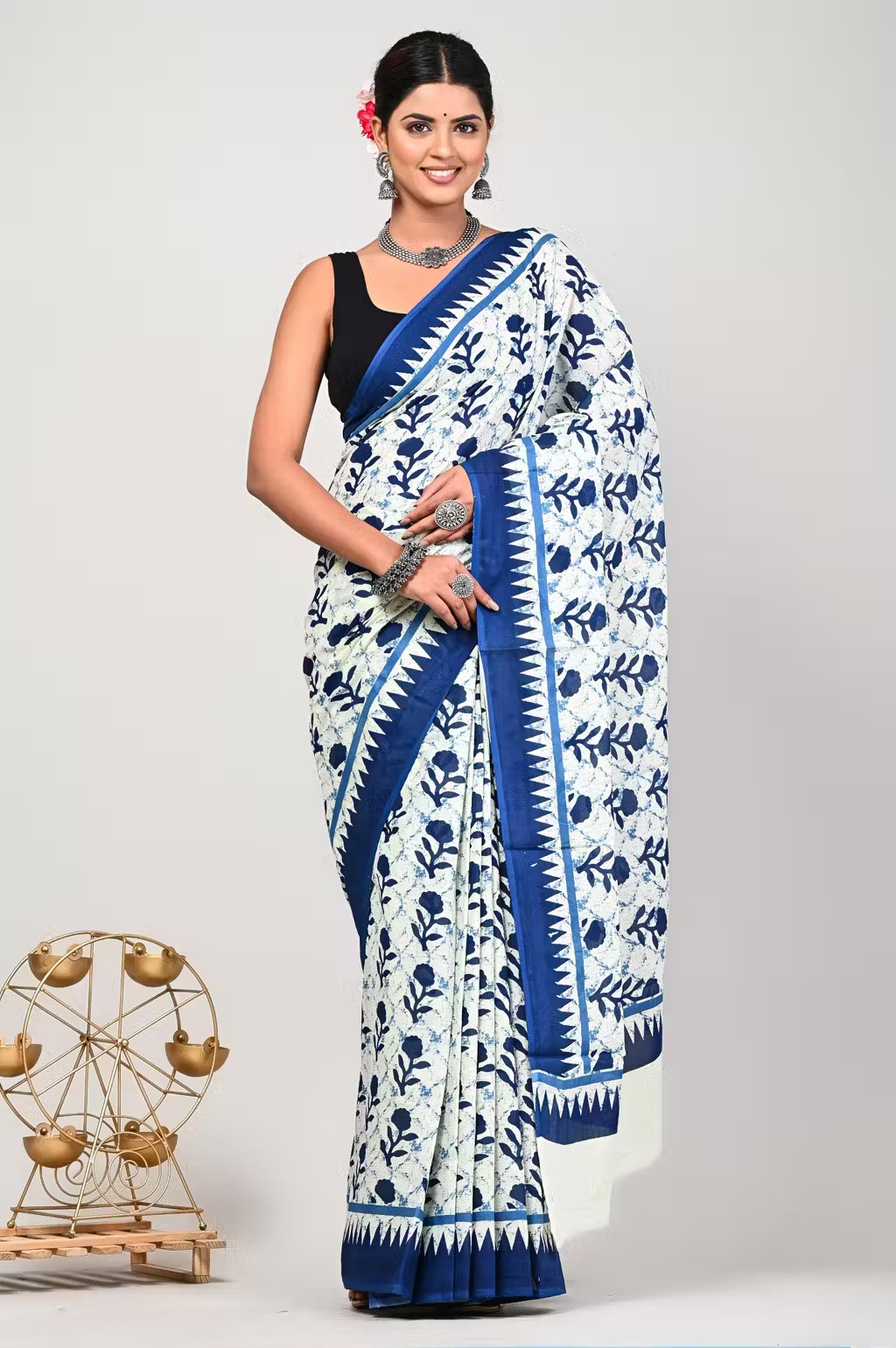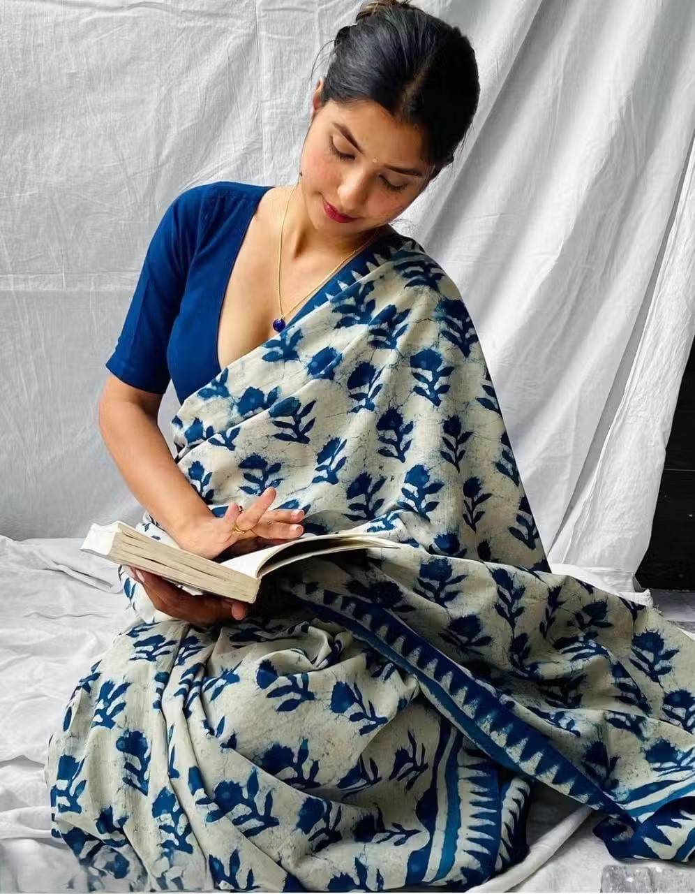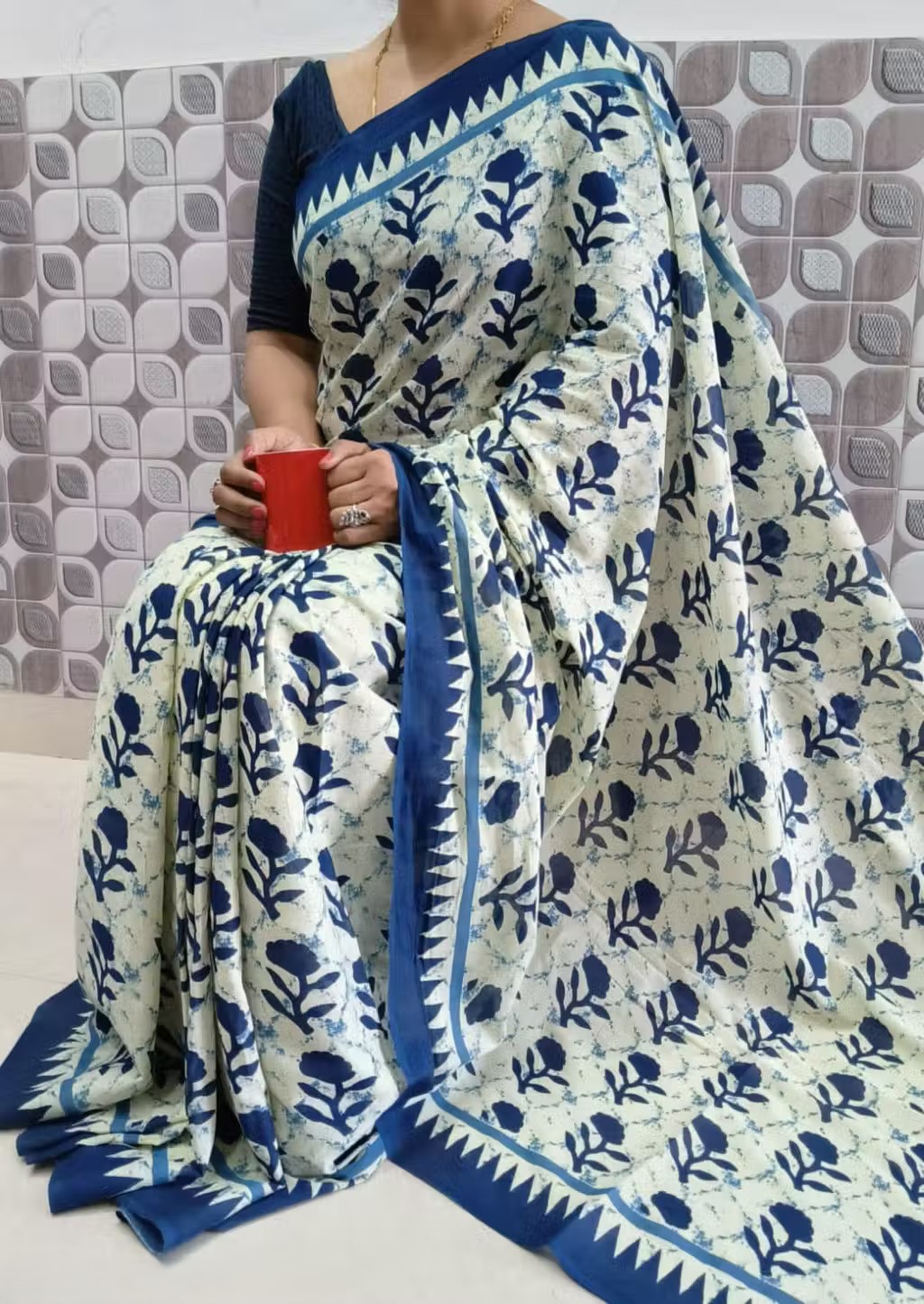 Jaipuri Bagru Batik Printed Saree Indigo Blue Hand Block Flower Printed Pure Cotton Mulmul Saree