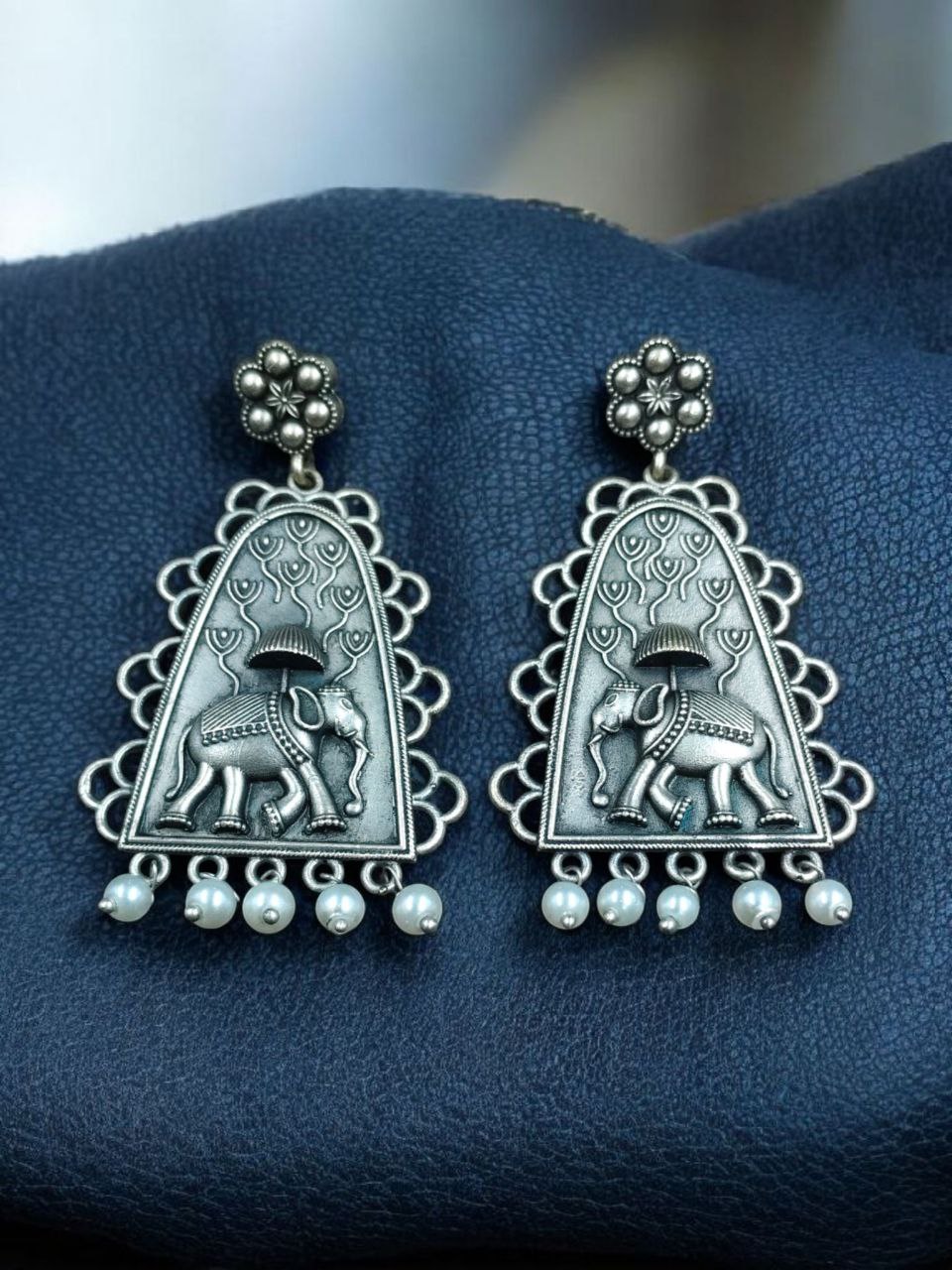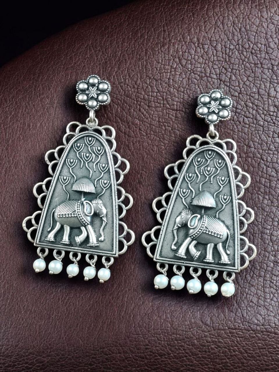 Antique Rustic Ethnic Earring Indian Elephant Dangler Brass Pearl Drops Designer Silver Oxidised Jewellery