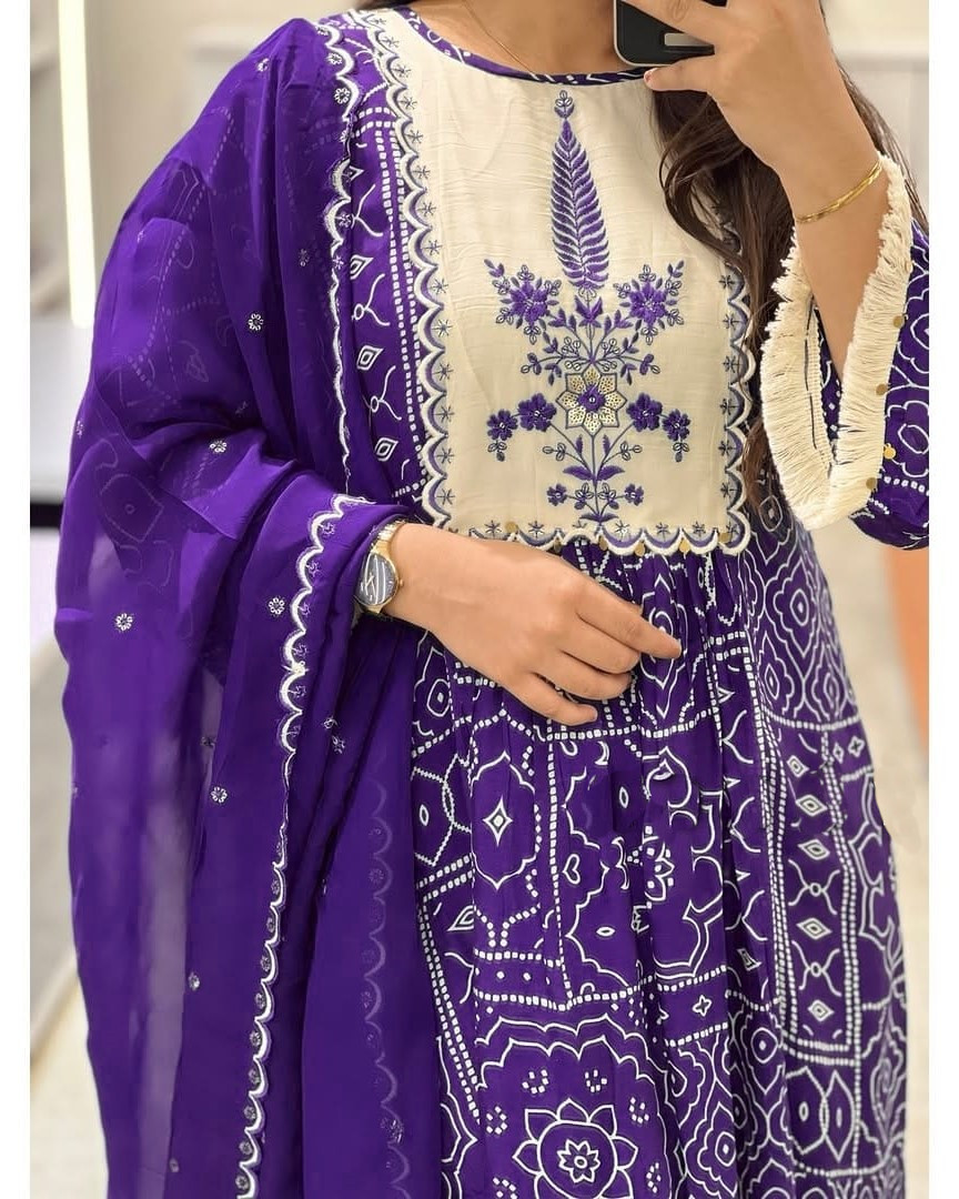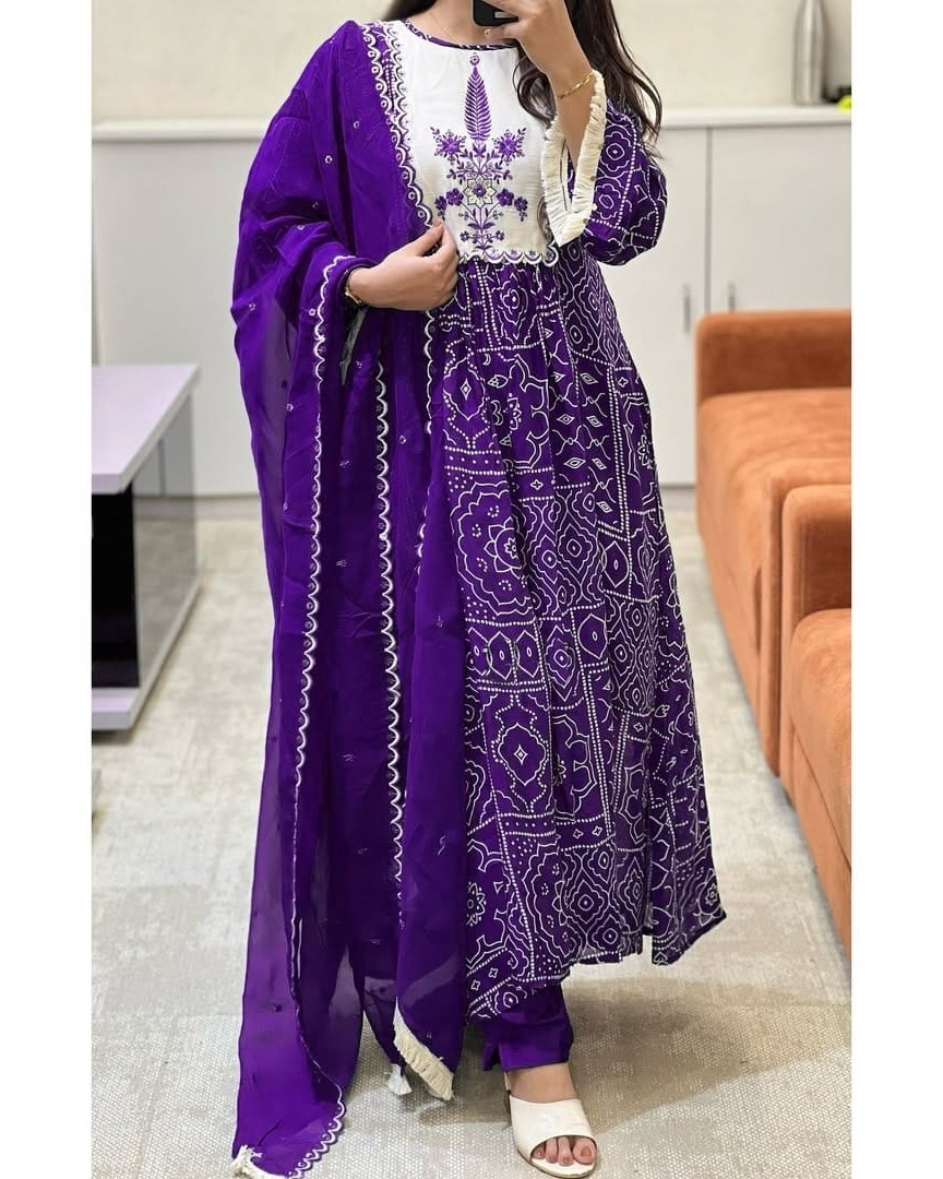 Elevate your ethnic charm with this Blue Printed Anarkali Frock Style Salwar Kameez Set. Crafted from soft, breathable fabric, it features a graceful flared kurti adorned with intricate prints, paired with matching pants and a stylish dupatta. Perfect for festive occasions, family gatherings, or cultural events, this outfit blends traditional elegance with modern flair, ensuring you look effortlessly beautiful and comfortable all day.