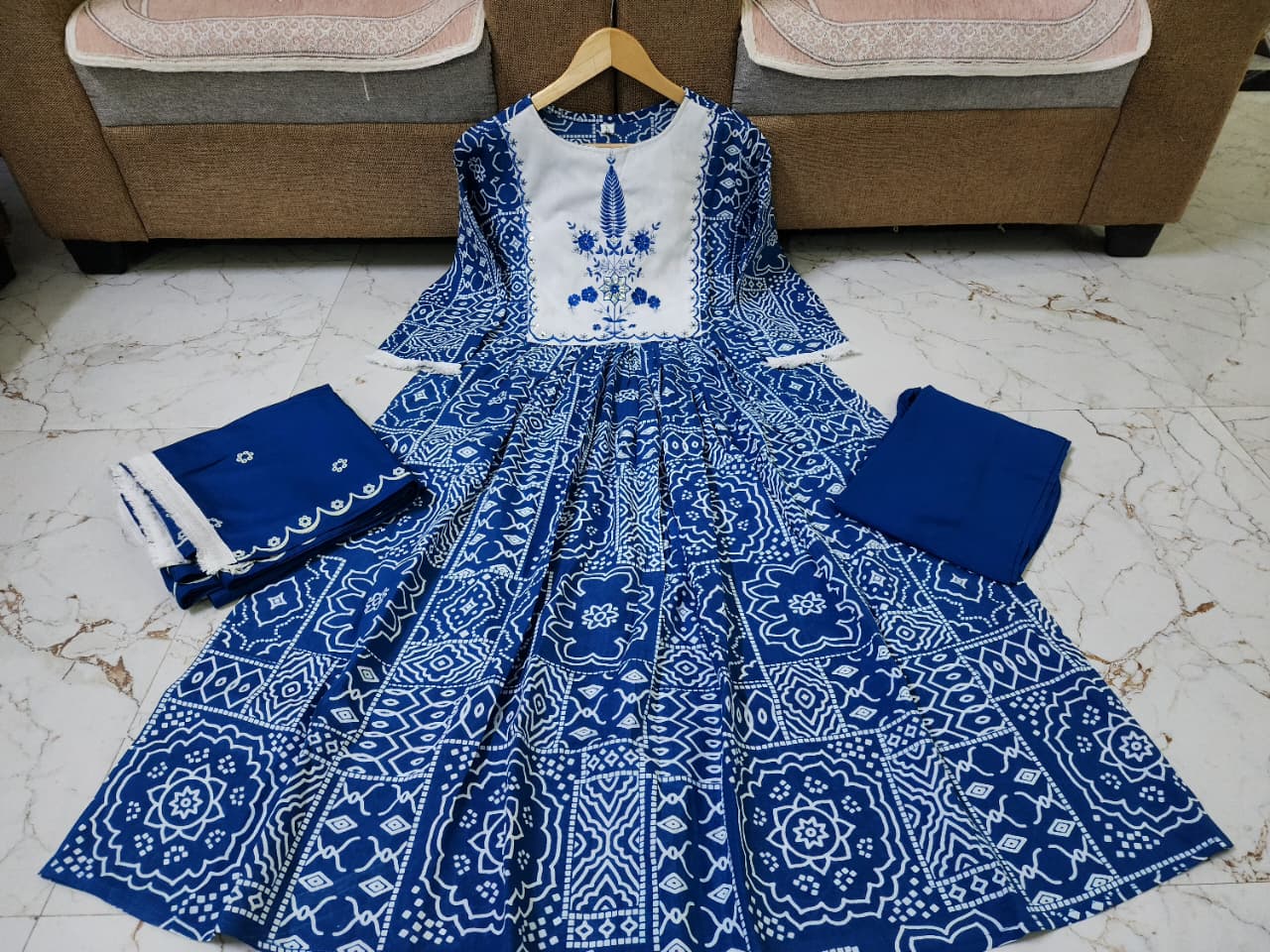 Blue Printed Anarkali Frock Style Ethnic Indian Pakistani Salwar Kameez Kurti Pant Dupatta Set