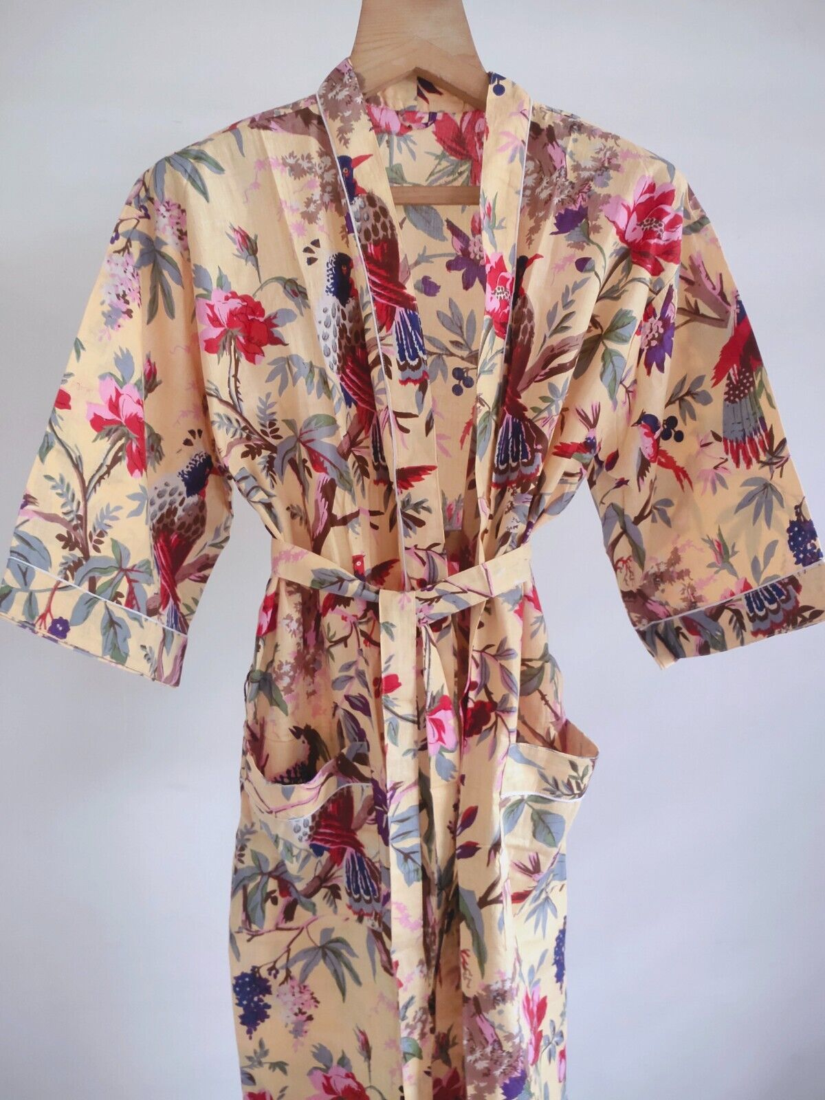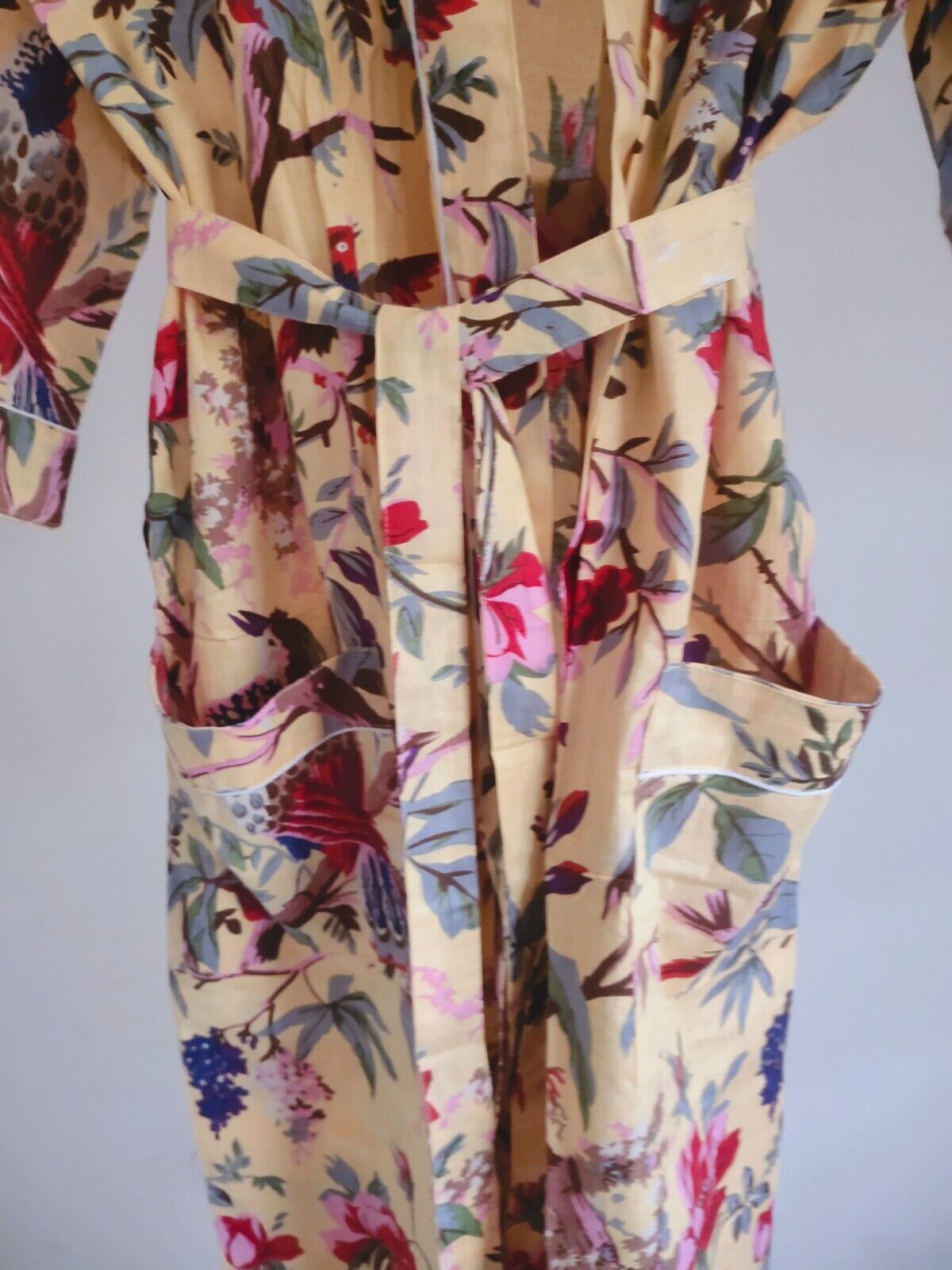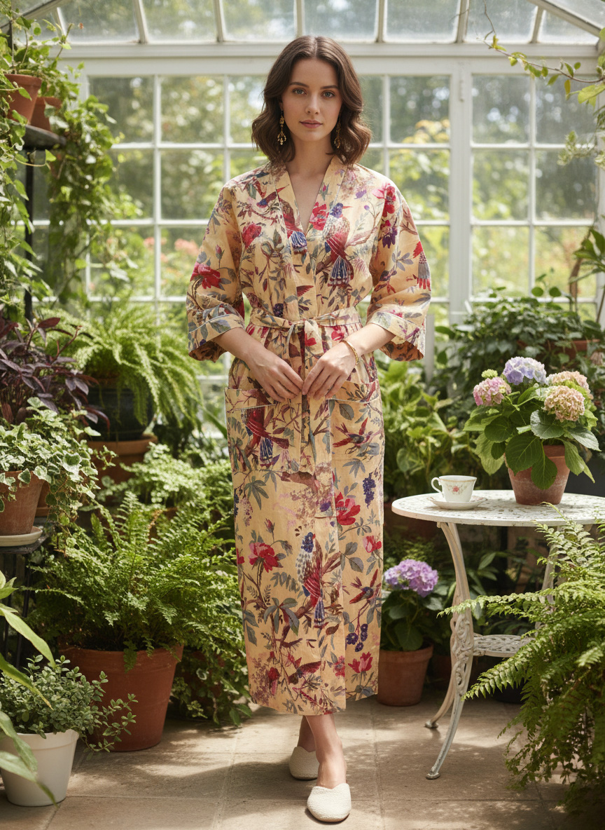 Cotton Beige Bird Paradise Indian Printed Cotton Kimono Nightwear Robe Women Dress Gown Maxi