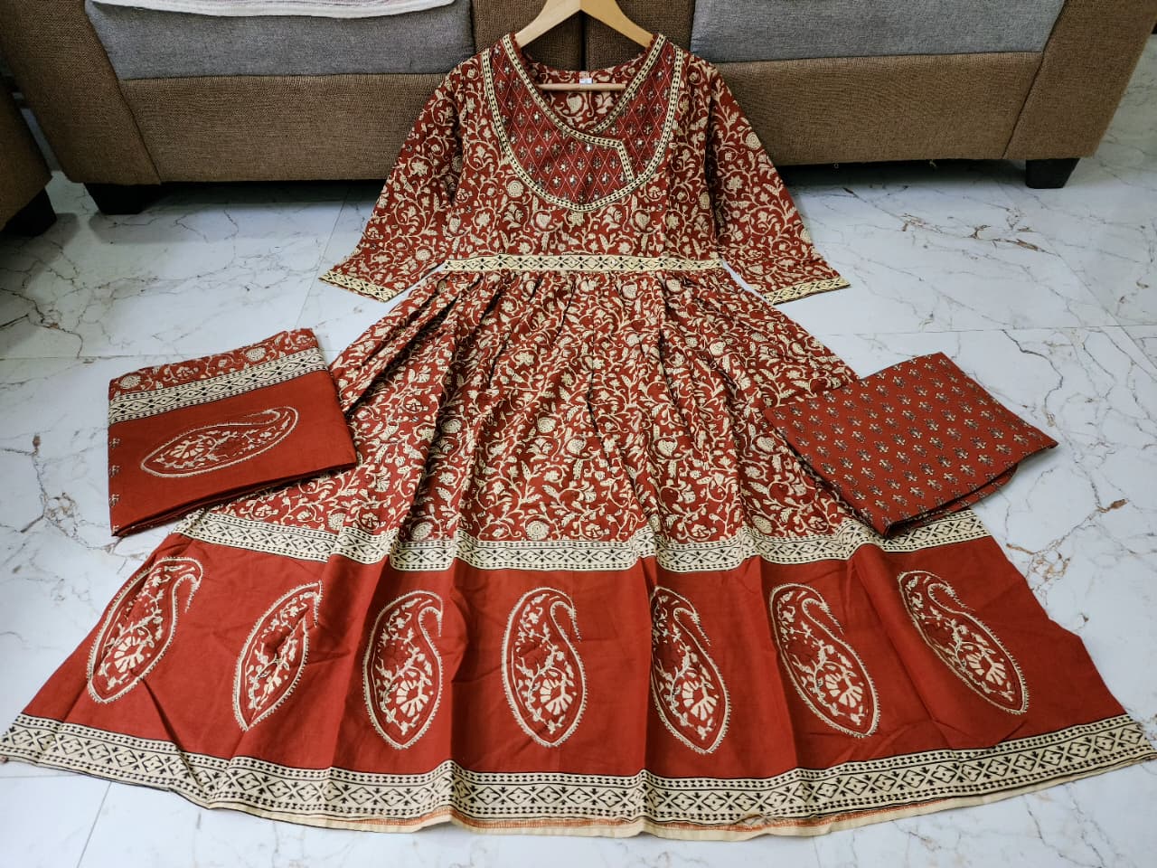 This elegant Anarkali kurta set features a beautiful Rust Orange floral hand block print, perfect for adding a touch of traditional style to any wardrobe. Made from comfortable cotton fabric, this set includes a flared kurta, matching pants, and a dupatta. Ideal for both casual and festive occasions, this outfit offers a blend of style and comfort. The intricate design and vibrant color make it a standout piece, ensuring you look and feel your best.
