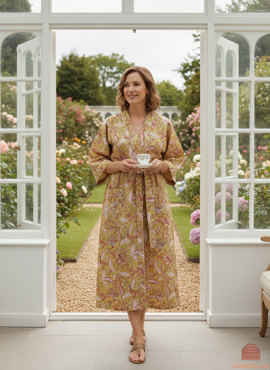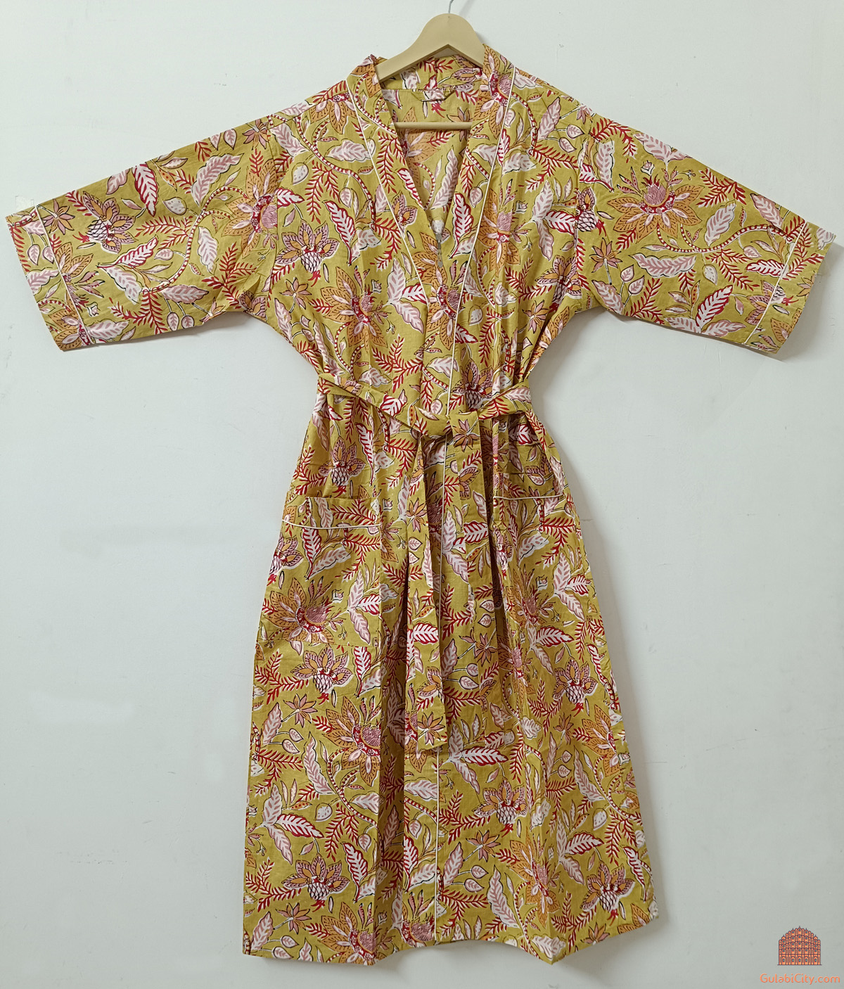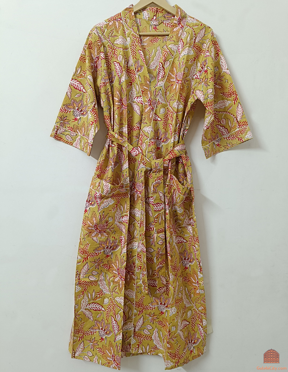 Mustard Yellow Floral Printed Kimono Robe Cotton Beach Cover Up Nightwear Bridesmaid Gown