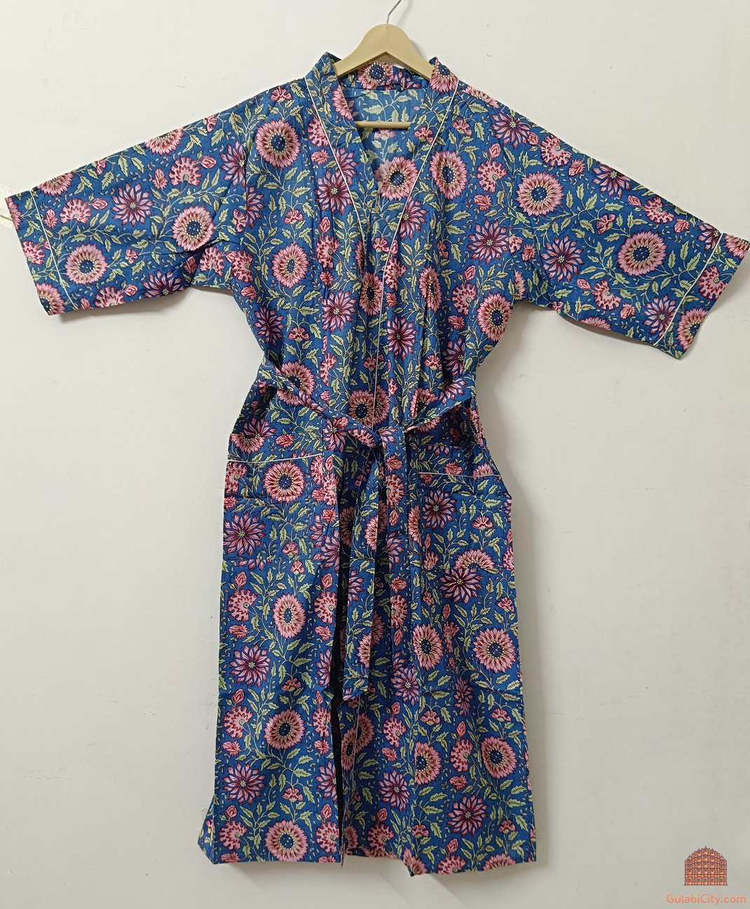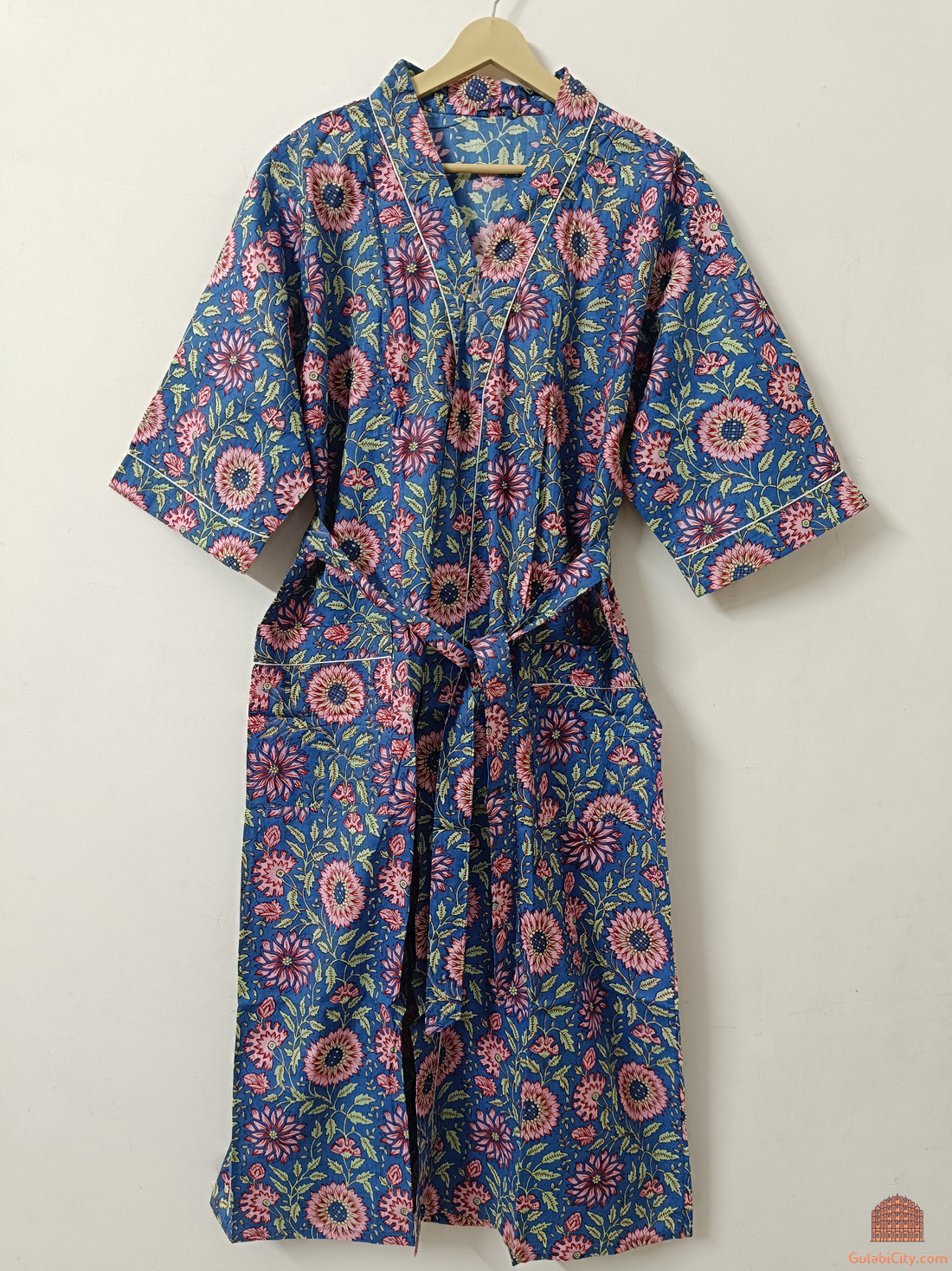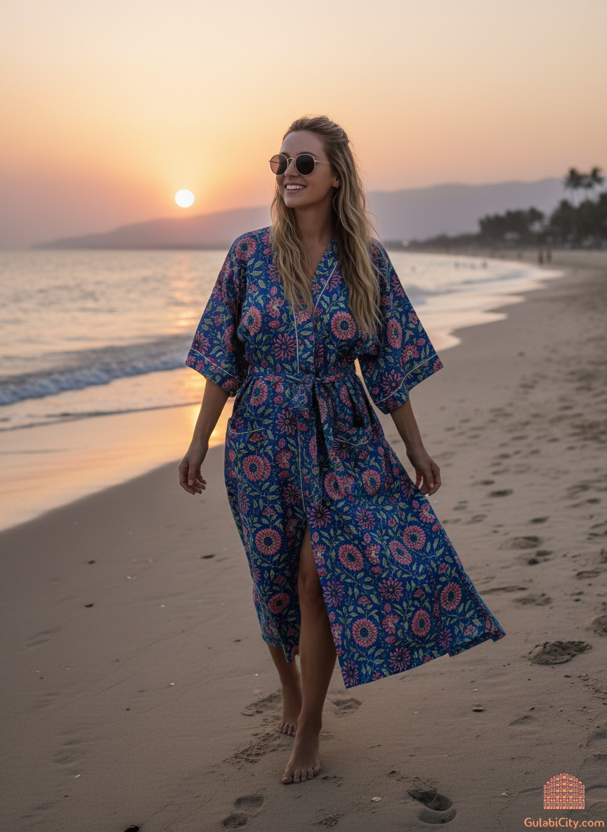 Blue Multi Floral Hand Block Printed Cotton Indian Kimono Bathrobe Handmade Bikini Cover-up Robe